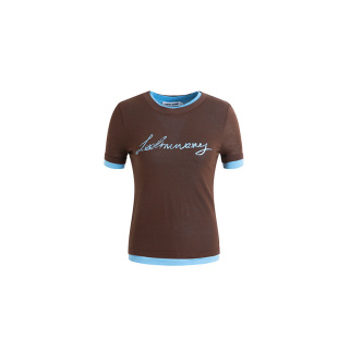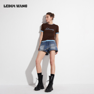 LEDIM 圆领上衣简约百搭 WANG撞色假两件T恤女夏复古字母印花短袖