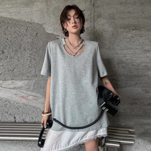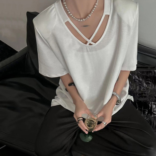 中长款 夏季 正肩t恤女宽松慵懒垫肩上衣 u领t恤女2026新款 黑色短袖