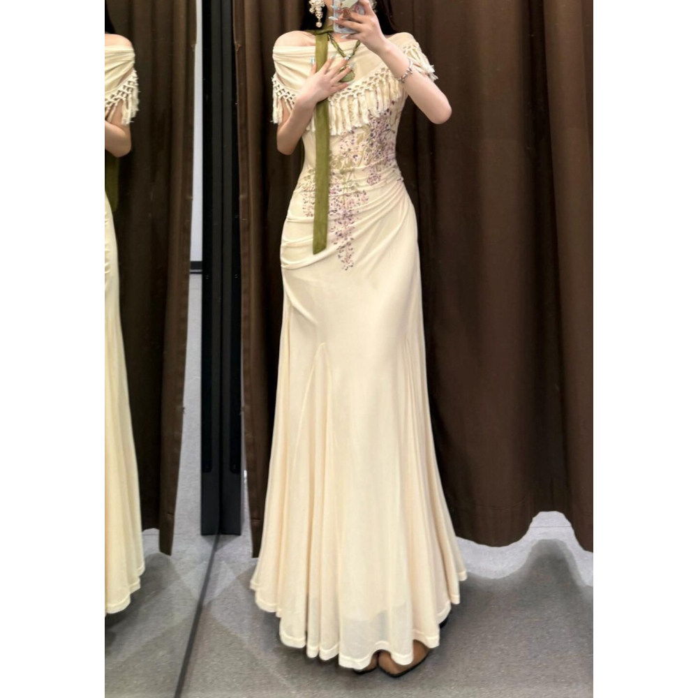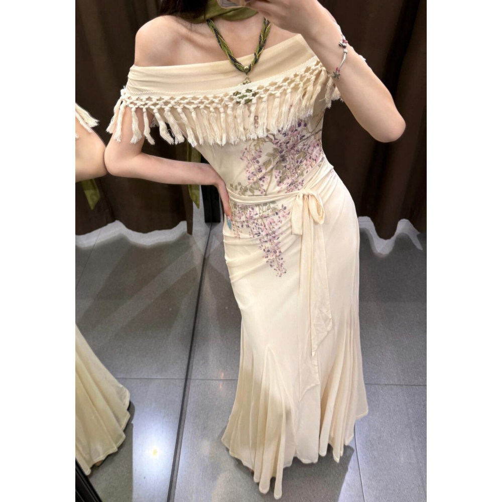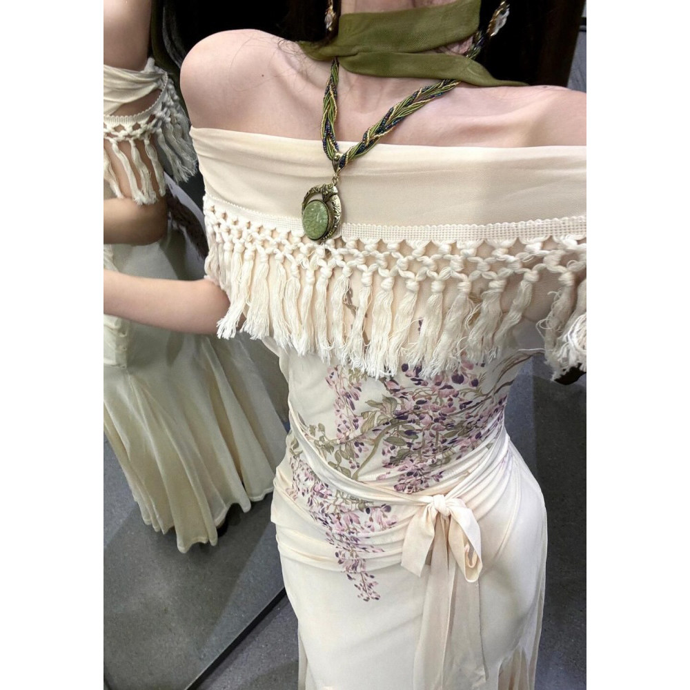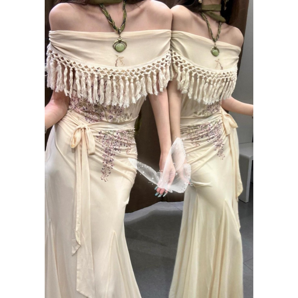 新款 少女波西米亚鱼尾连衣裙微胖显瘦包臀裙 流苏露肩遮肉手臂修身