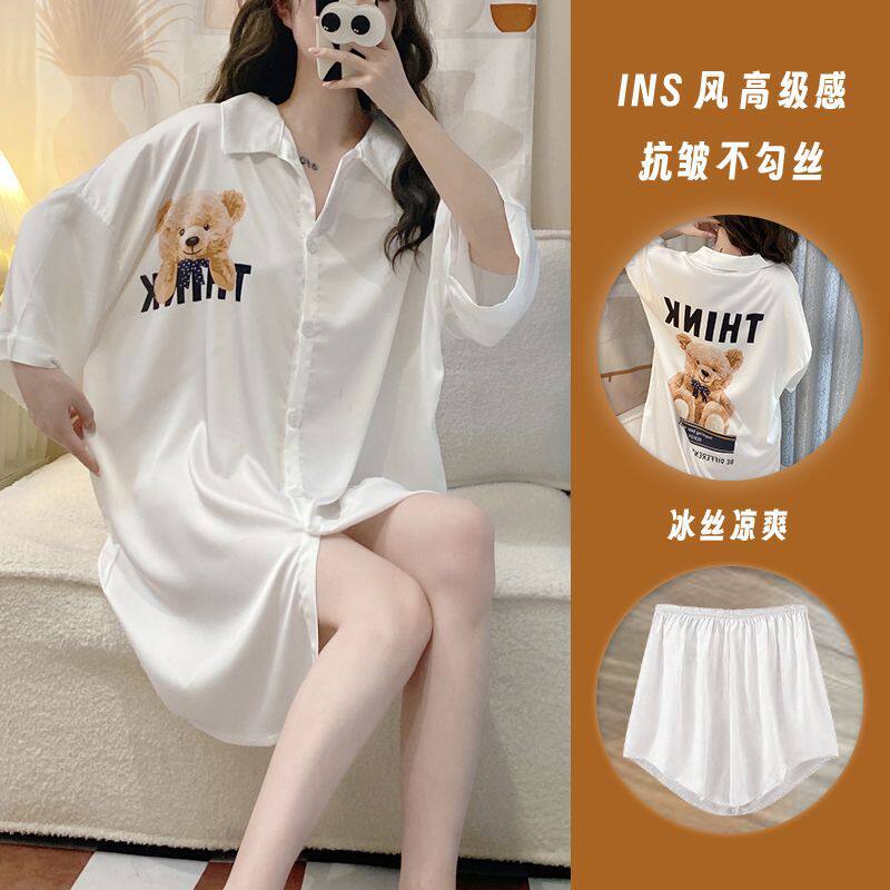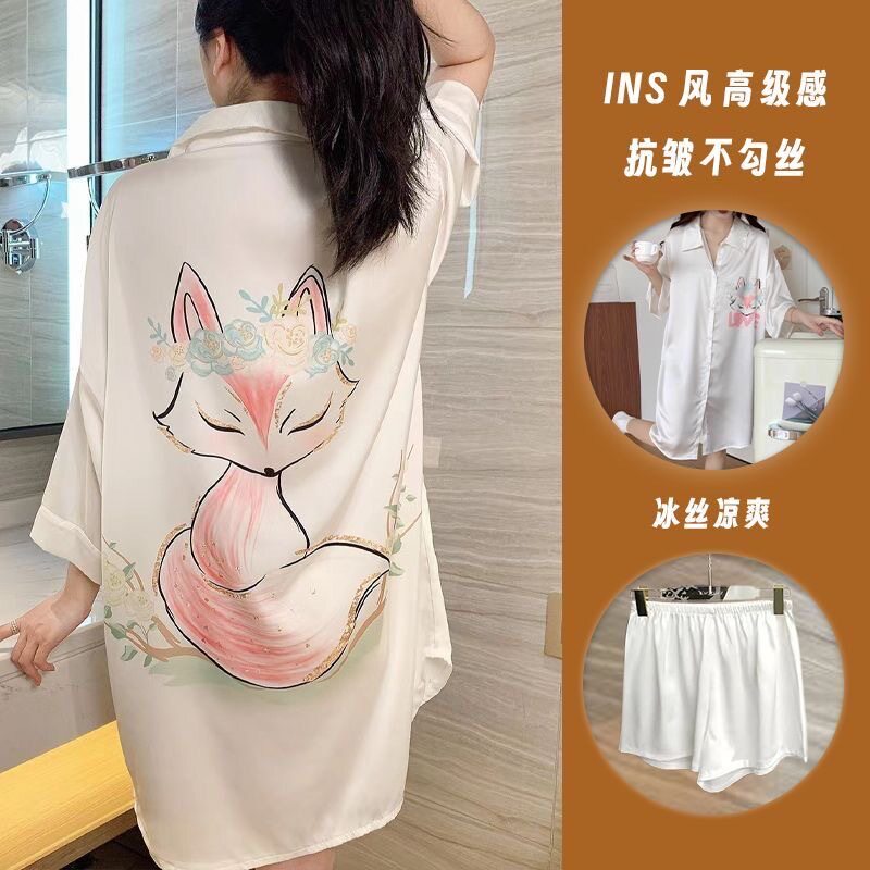 甜美卡通宽松薄款 夏季 睡衣女短裤 睡裙性感冰丝短袖 家居服 衬衫