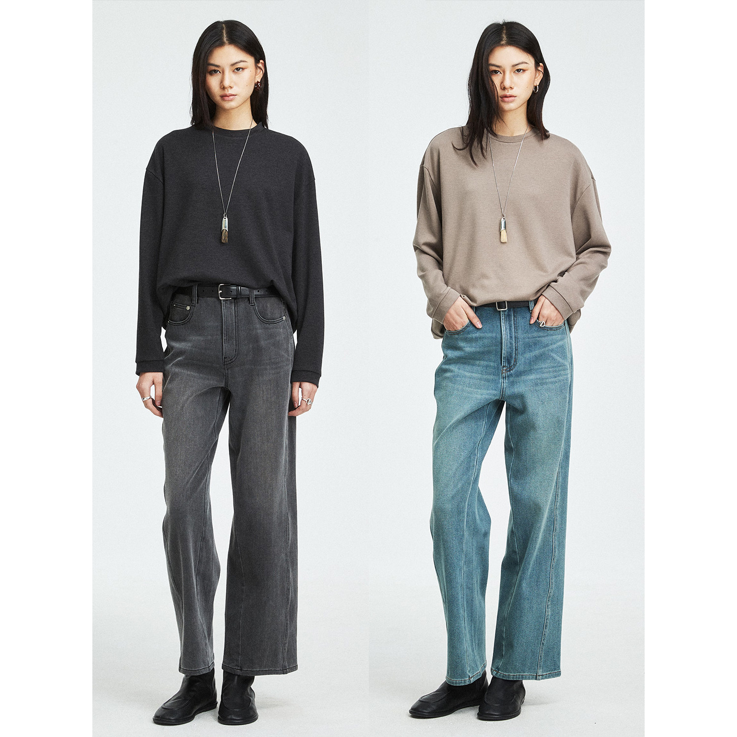 子 高腰垂坠感直筒阔腿裤 浅蓝色牛仔弯刀裤 女秋冬加绒加厚2025新款