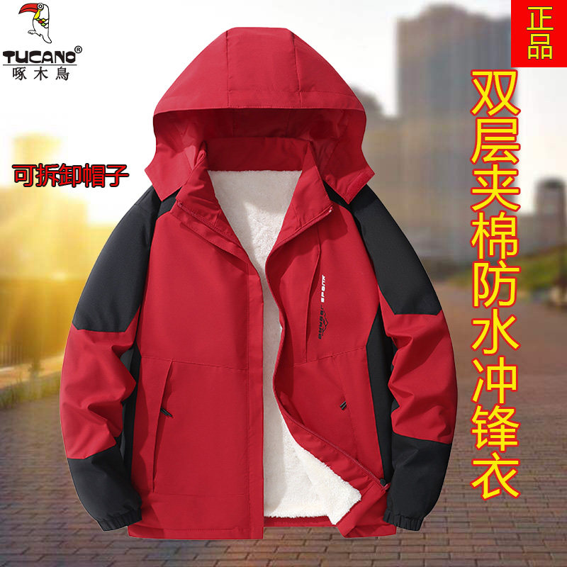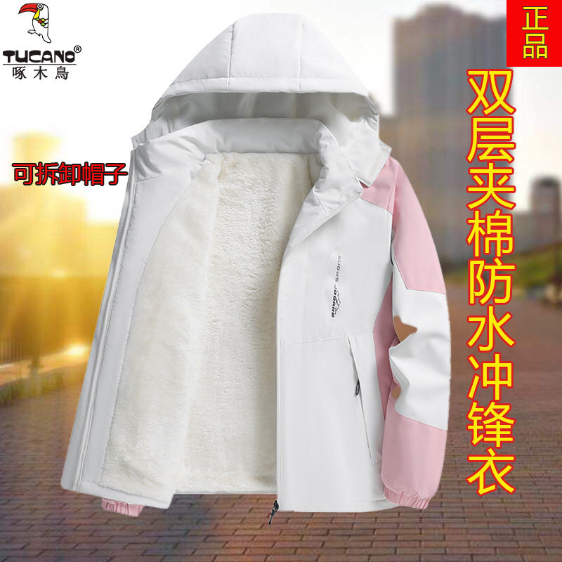 啄木鸟正品 女士棉服棉袄拼接潮 冲锋衣加绒夹棉外套女2024秋冬新款