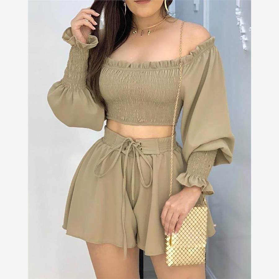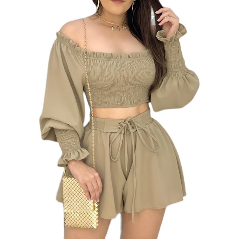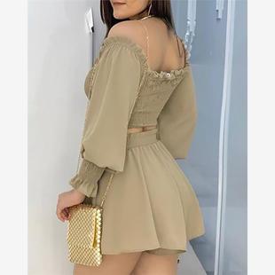 Crop Top Shorts Off 套装 Ruched Set抽褶绑带上衣短裤 Shoulder