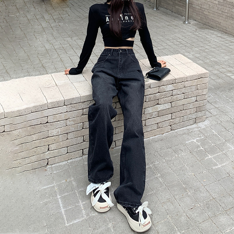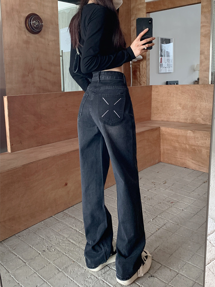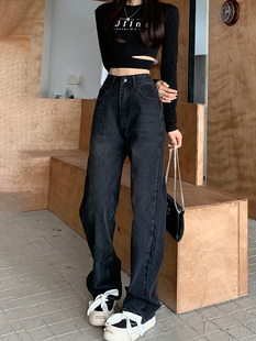 垂感拖地阔腿裤 胖mm高腰显瘦直筒裤 女秋冬大码 黑色加绒加厚牛仔裤