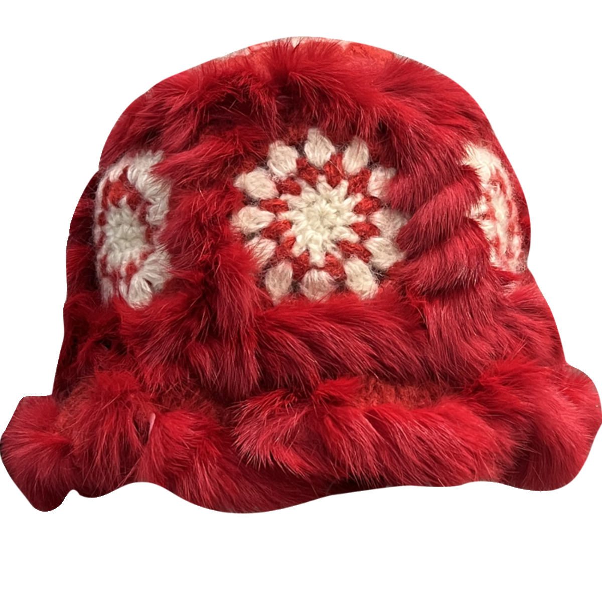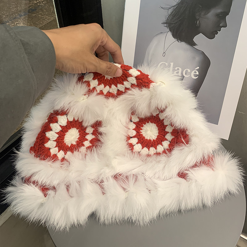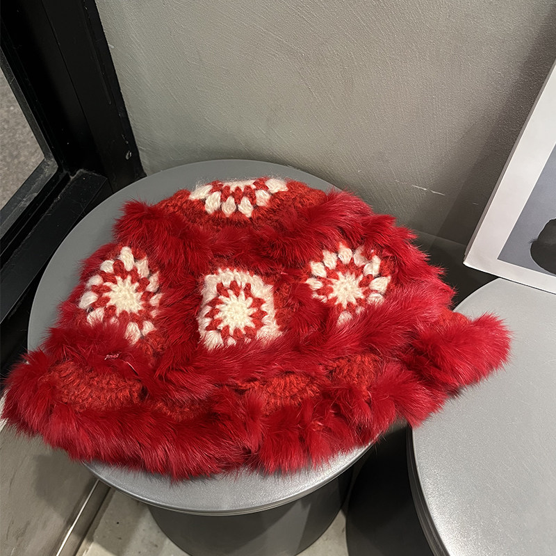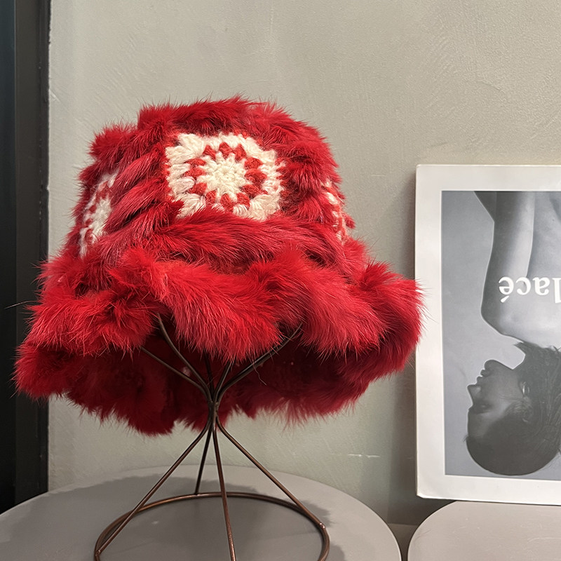 新年红色兔毛毛绒醒狮渔夫帽女冬季 圣诞节保暖毛线针织帽子本命年