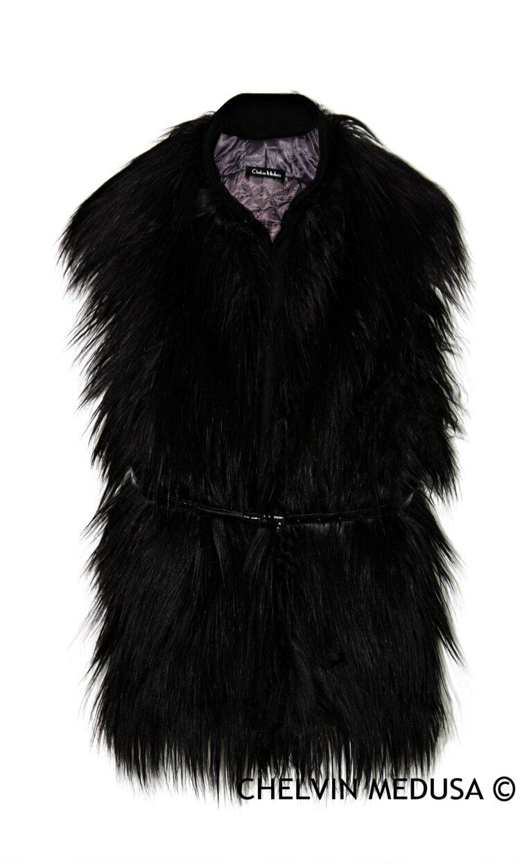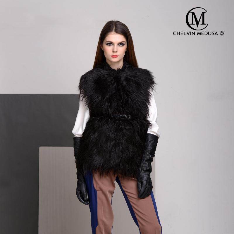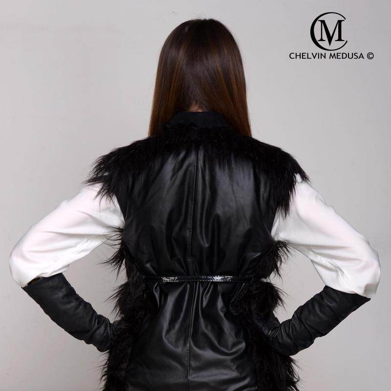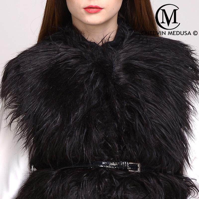 2020冬新款 欧美大牌大牌超长毛仿山羊毛拼皮草加厚腰带马夹马甲