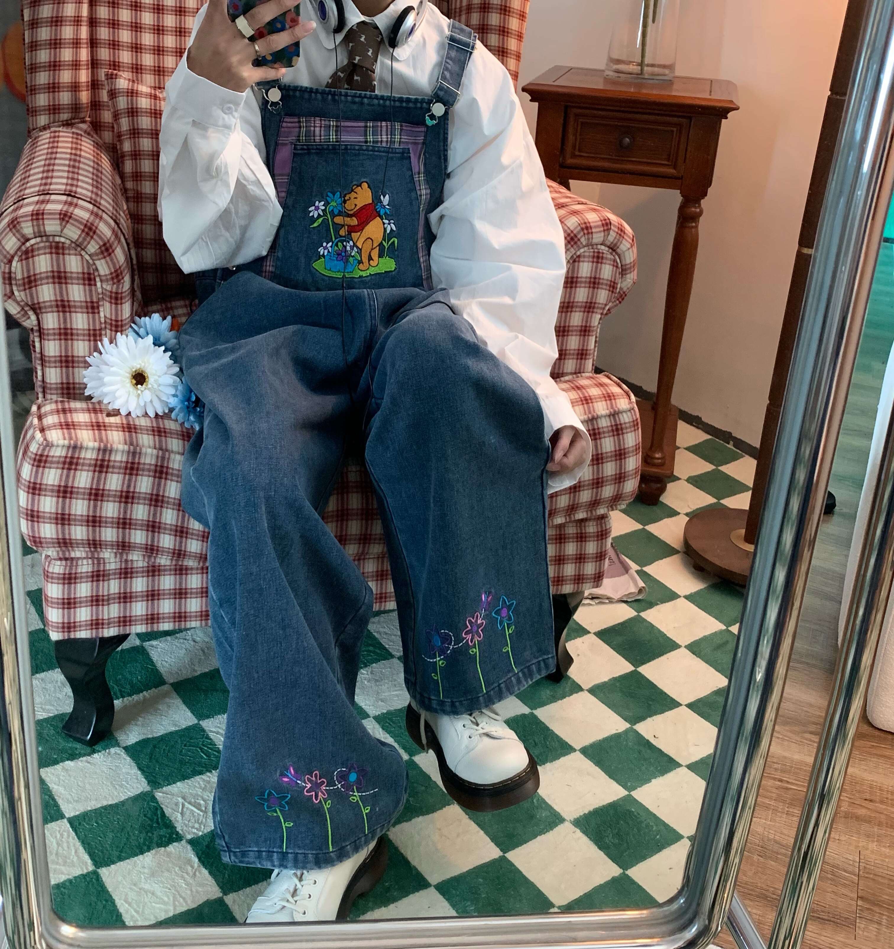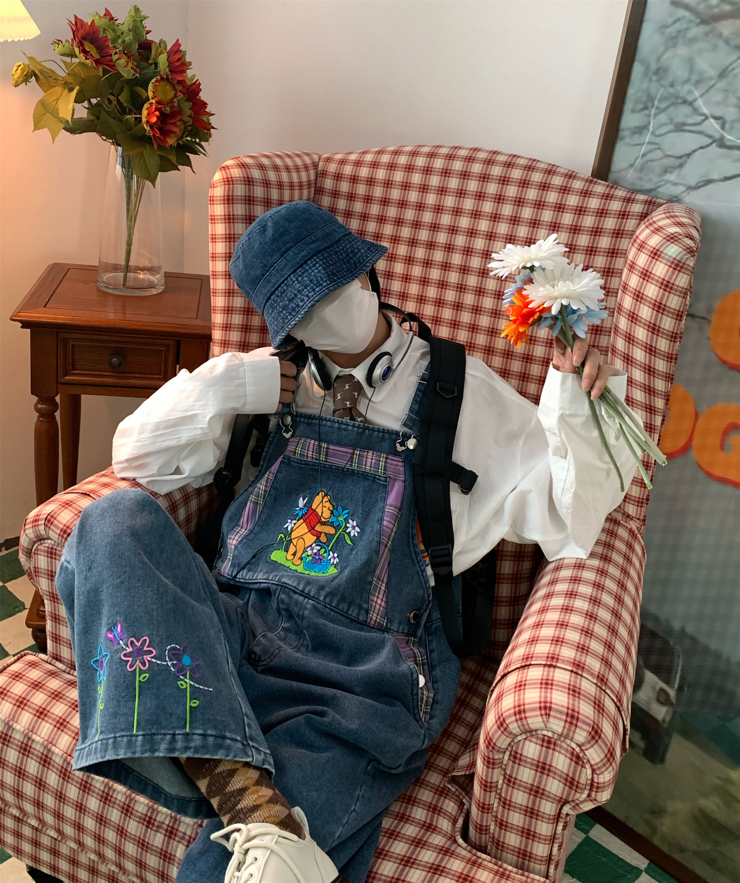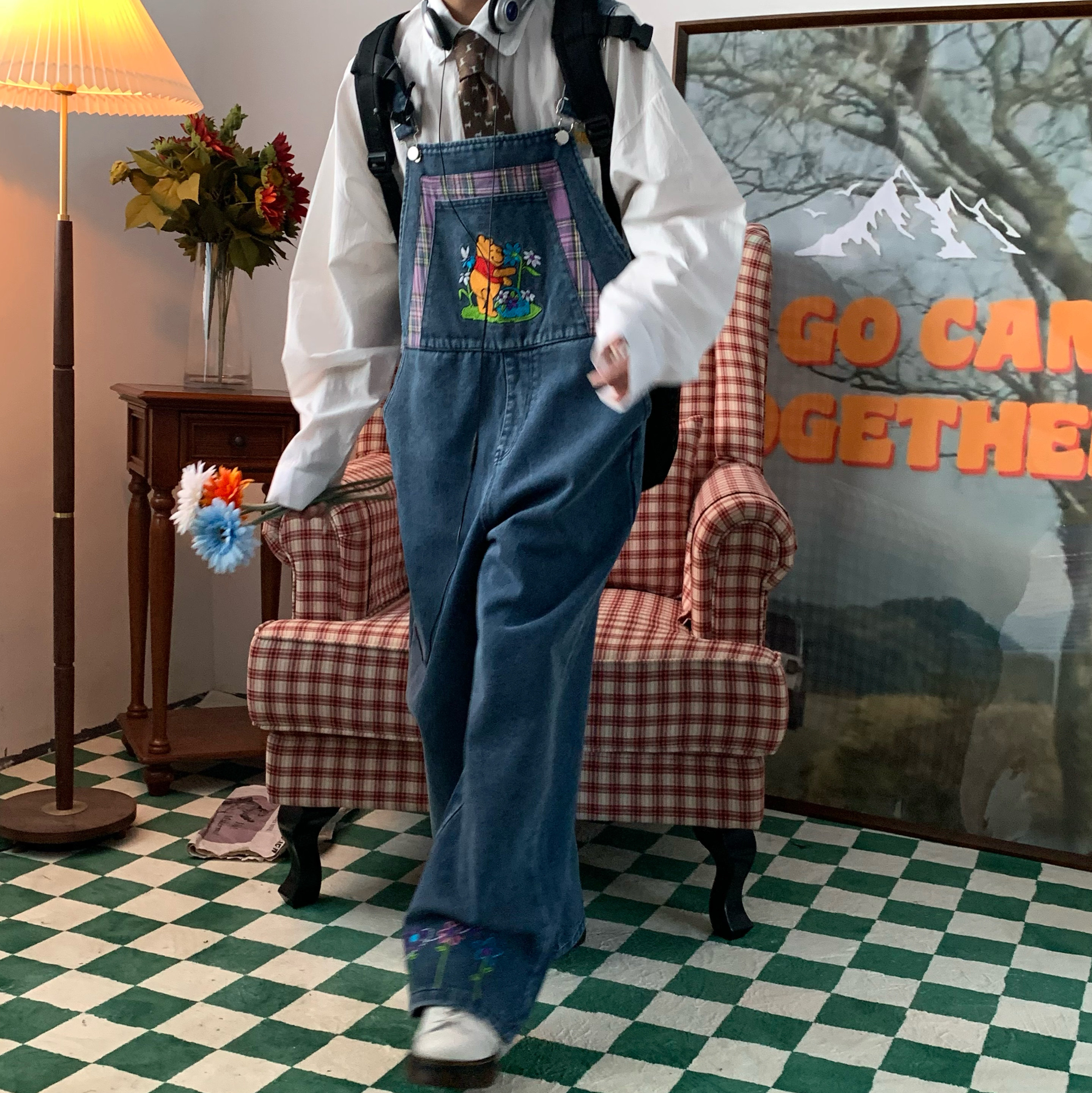 做旧宽松拖地裤 C2自制 背带裤 新款 小熊花朵刺绣复古牛仔2025秋季