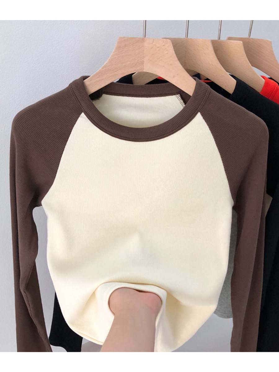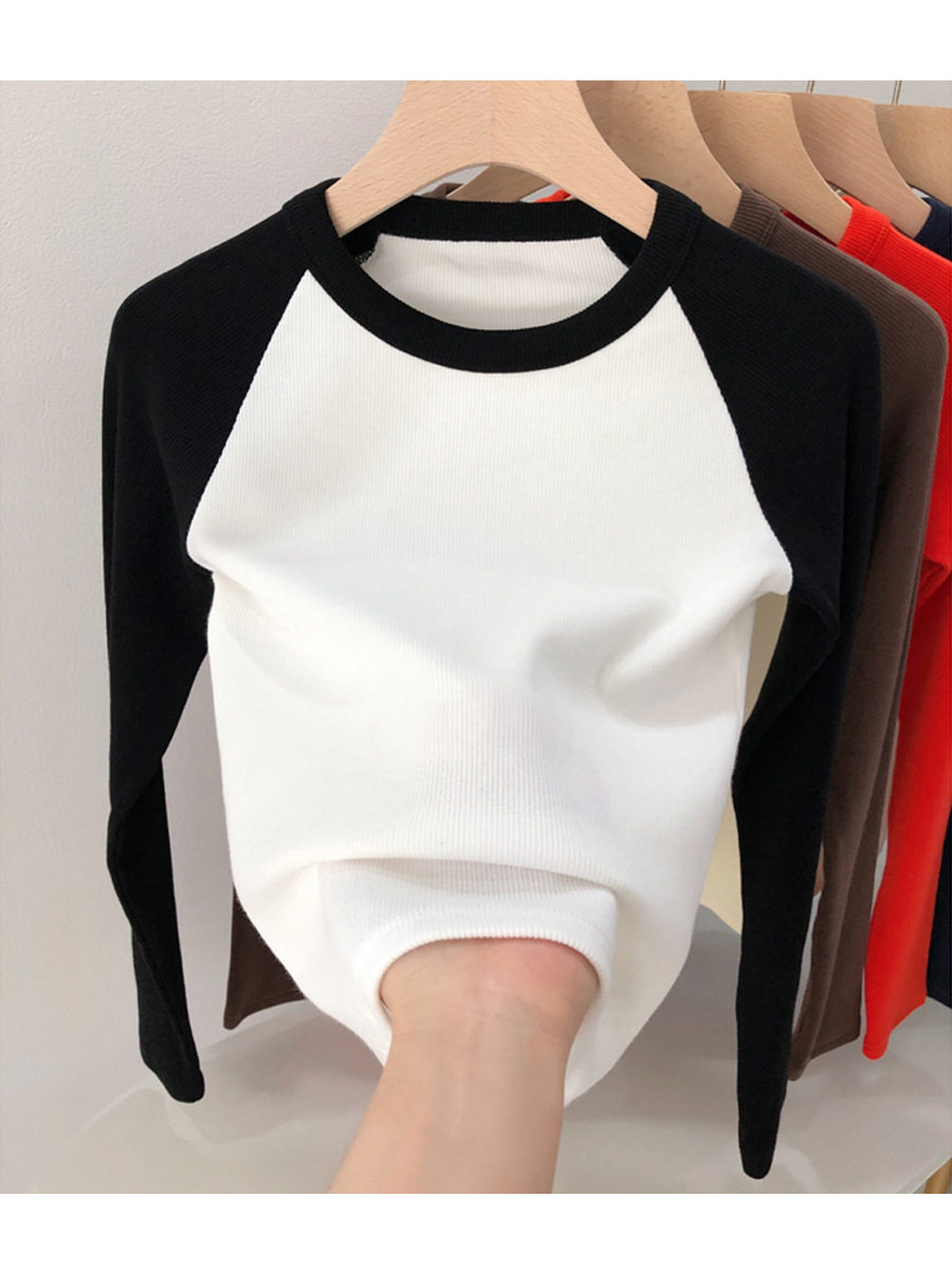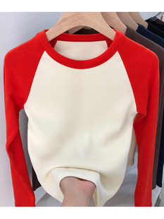 长袖 复古撞色插肩高腰修身 T恤女螺纹显瘦小众上衣 新款 2025秋冬装