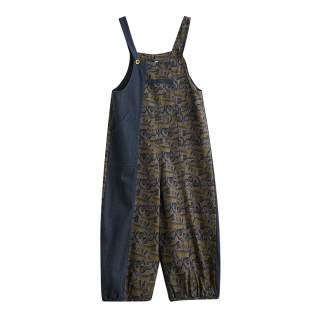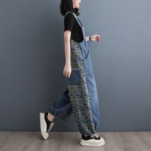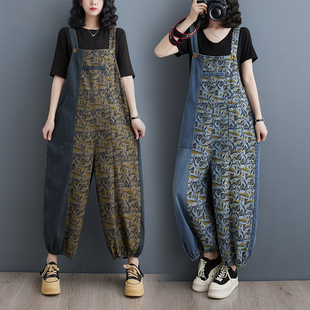 九分连体裤 春秋新款 胖mm宽松显瘦遮肉复古印花牛仔背带裤 女裤 大码