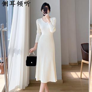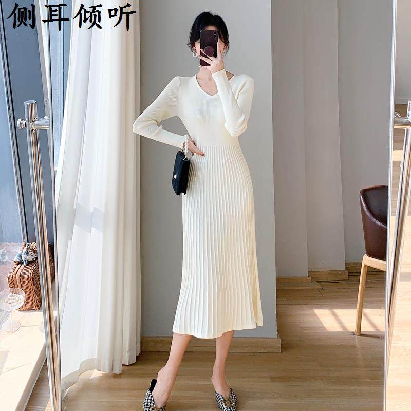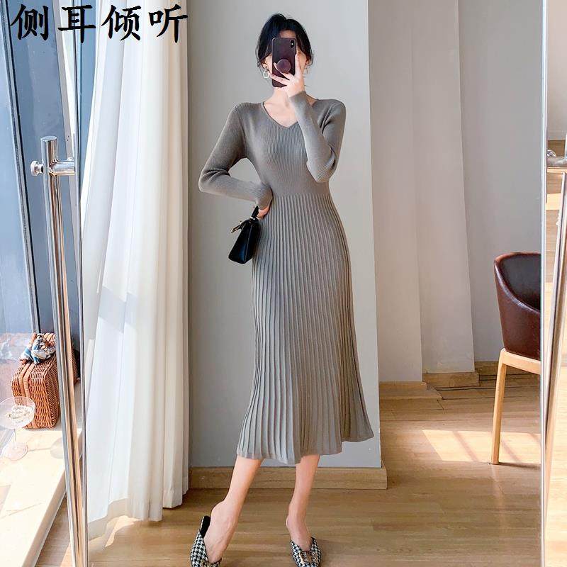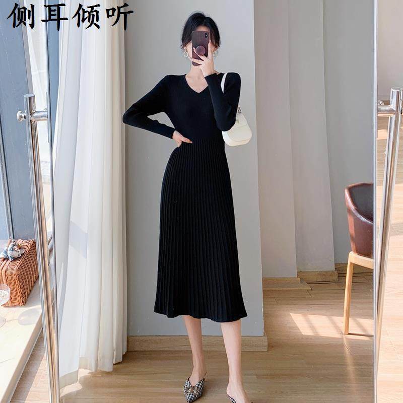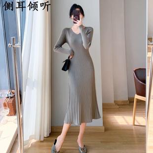 内搭打底毛衣裙秋冬季 法式 V领羊毛针织连衣裙女神范配大衣中长款