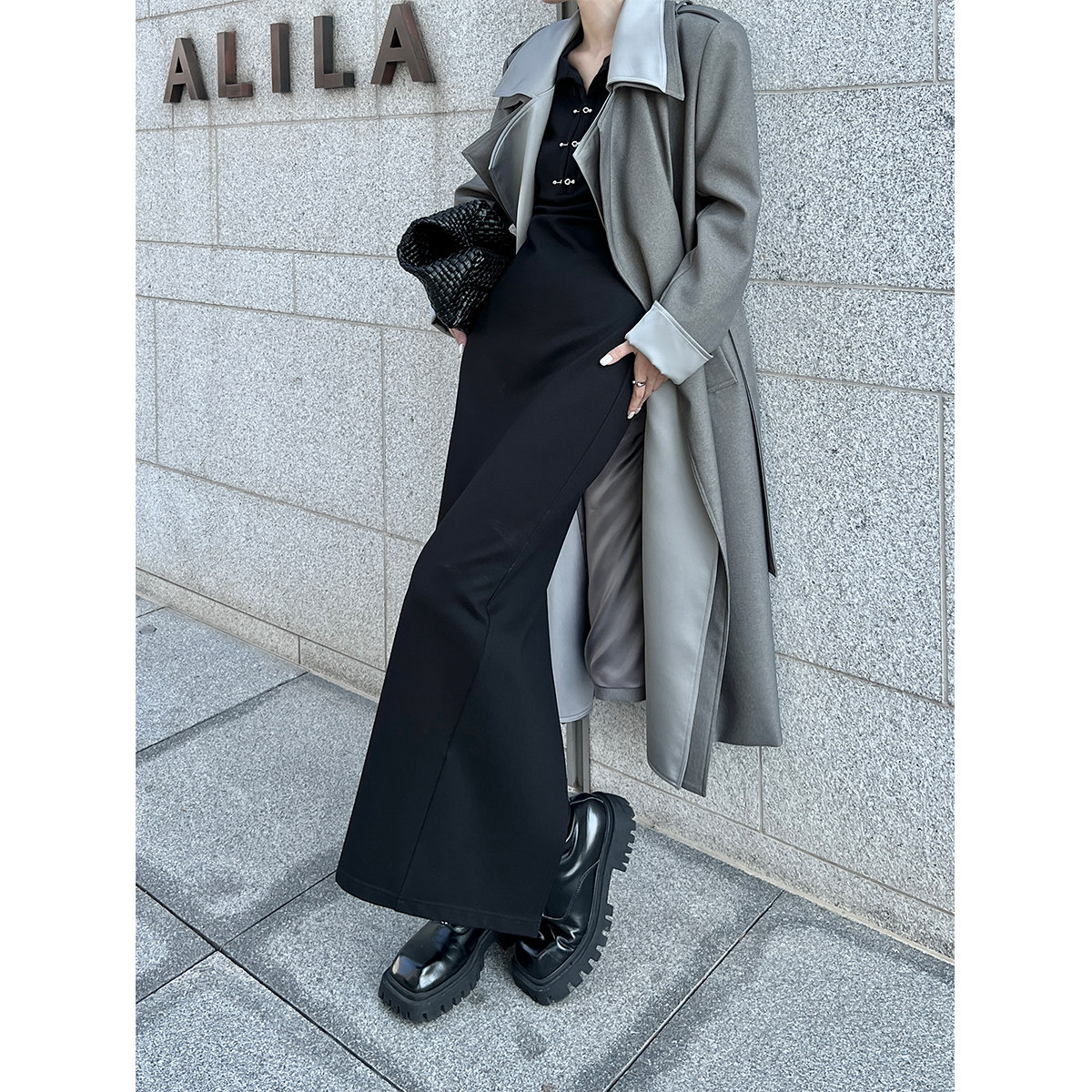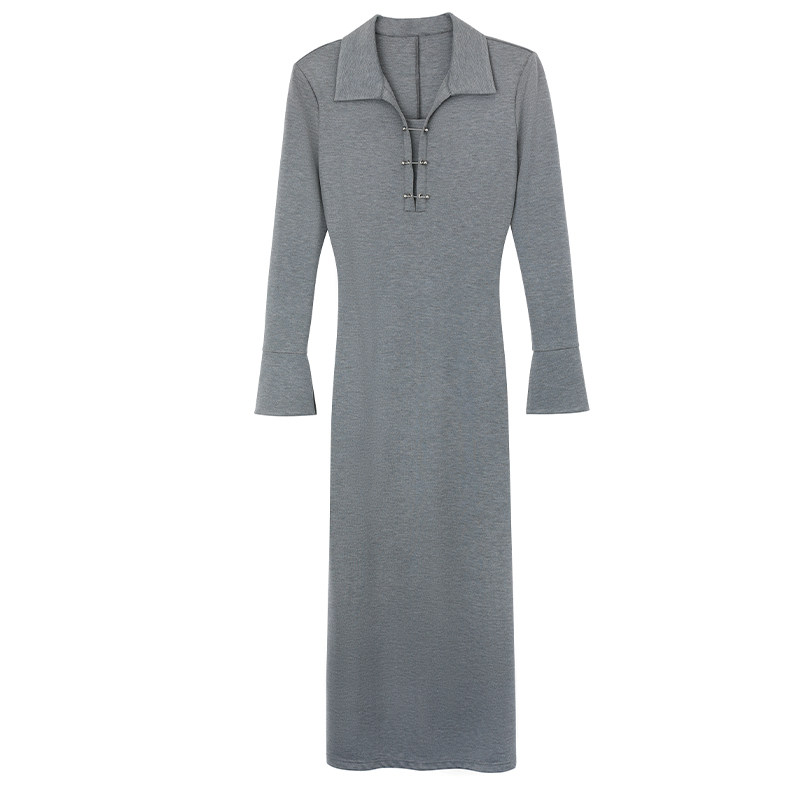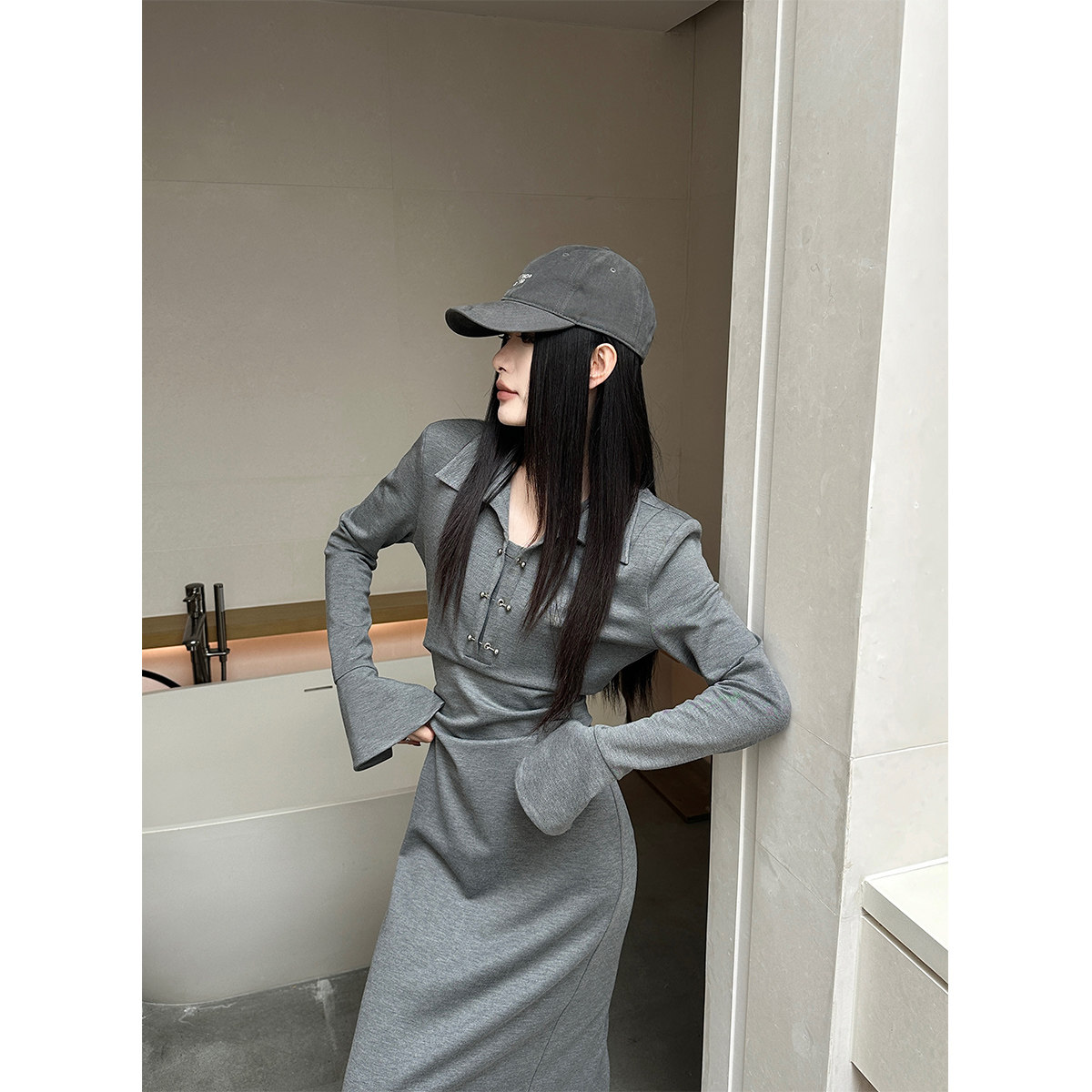 新款 秋季 高级感气质露肩A字长裙 灰色一字肩针织连衣裙长袖 MULVAN