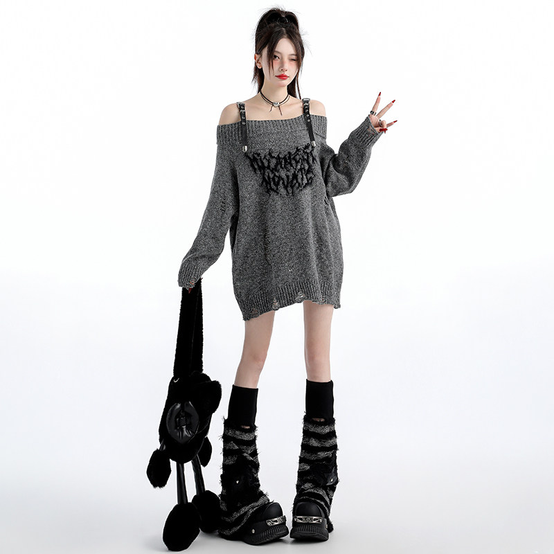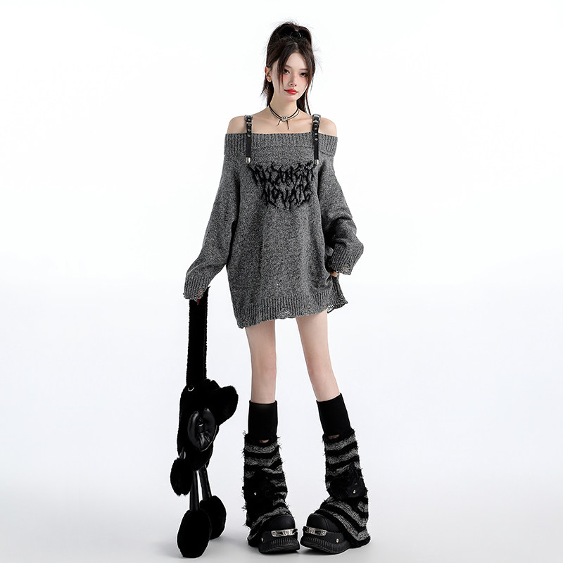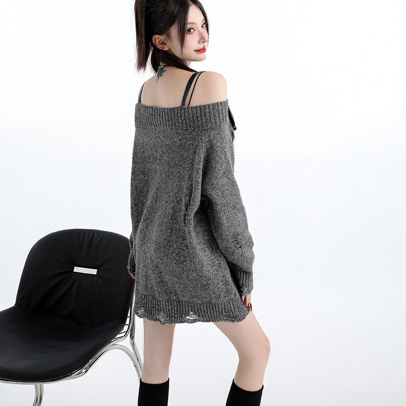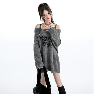 原创甜辣风一字肩破洞毛衣女辣妹中长宽松慵懒高级感针织衫 上衣