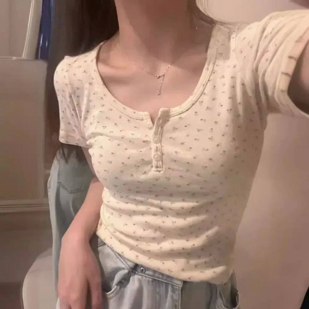 fit 上衣 floral 修身 u领碎花短袖 top slim sleeved short neck