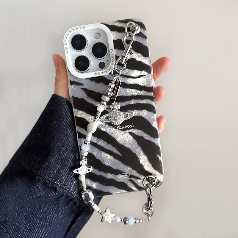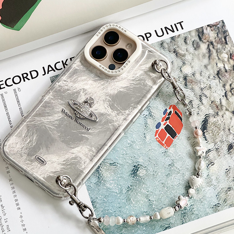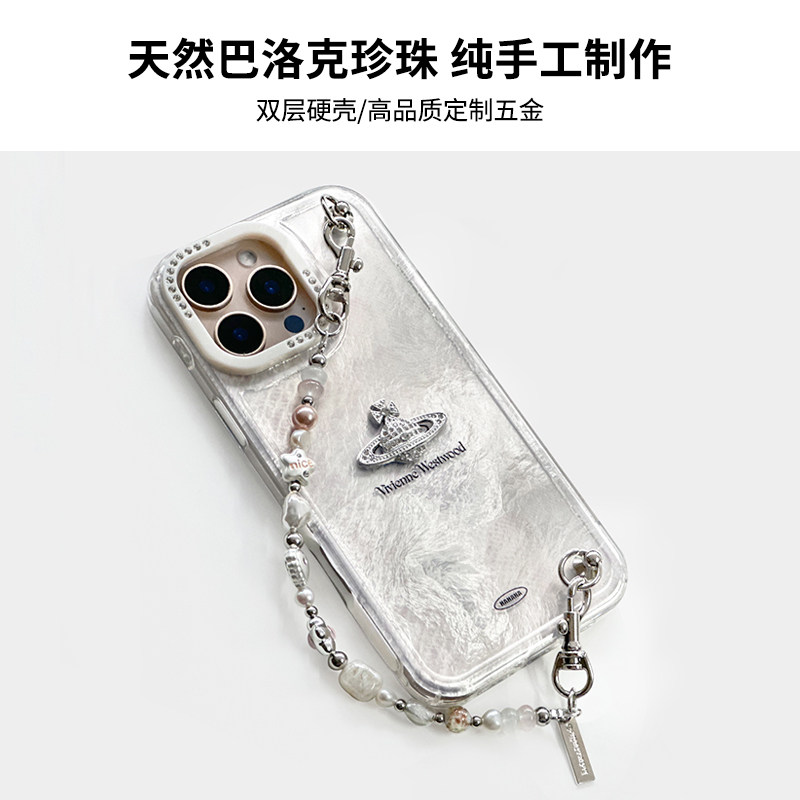 防摔冷淡锡纸镜头水钻土星手链适用iphone17promax天然珍珠链条手机壳高级苹果16原创小众仙女印花全包软壳