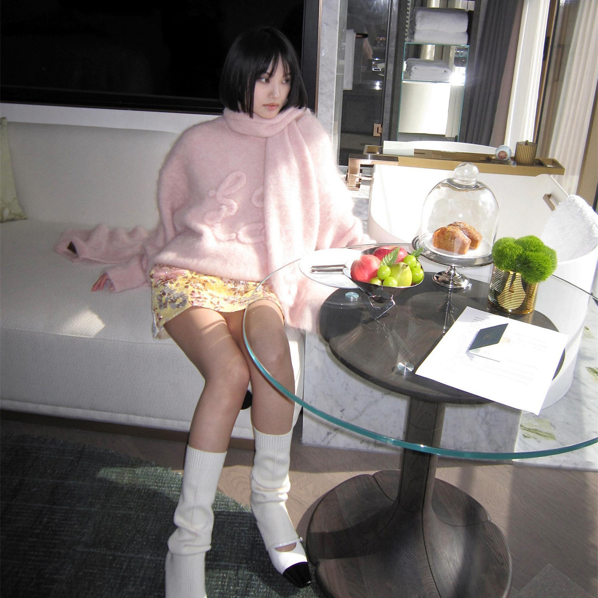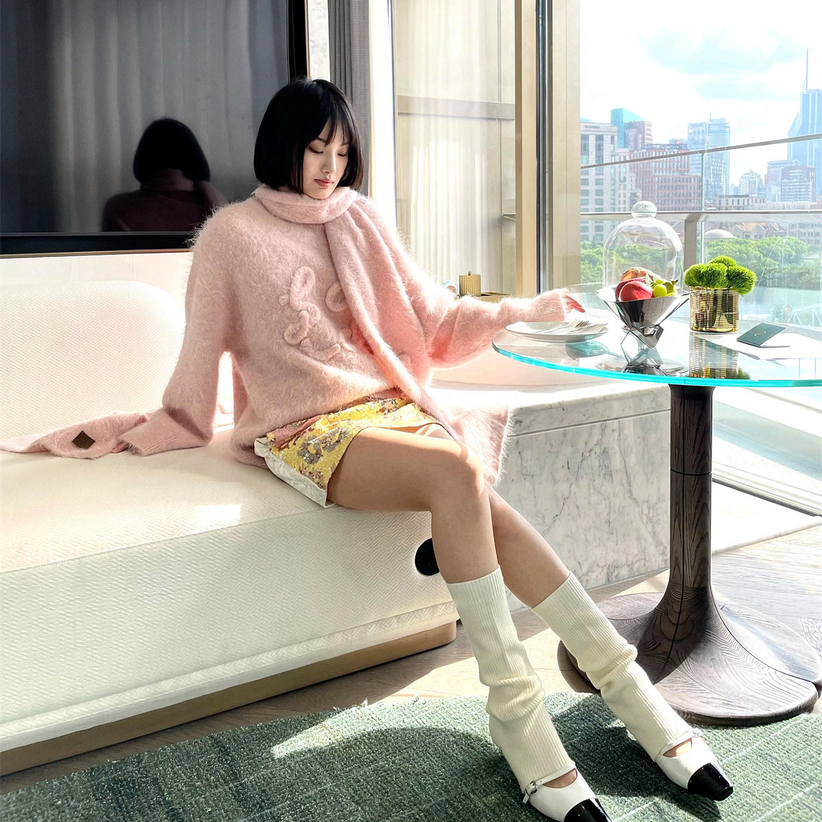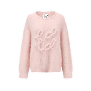手工羊驼毛logo盘花宽松 2024秋冬新款 ODTD 粉色套头毛衣 折
