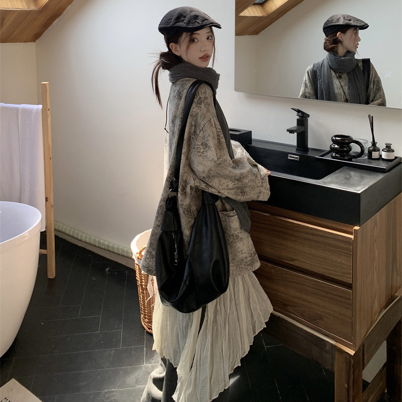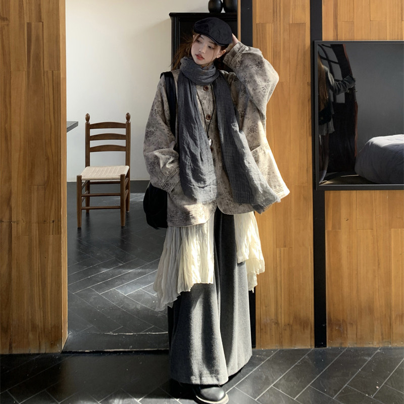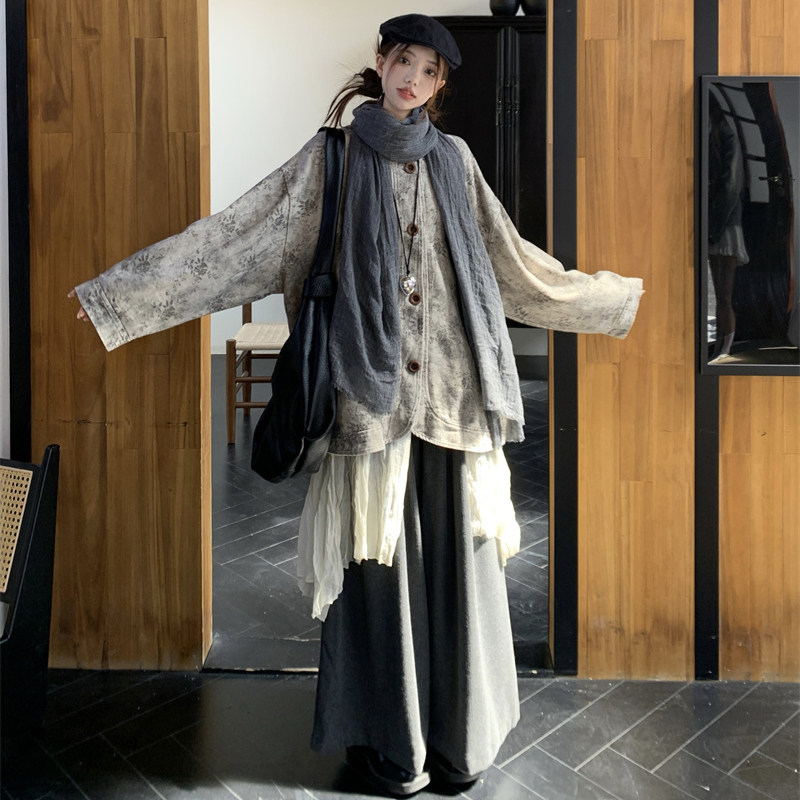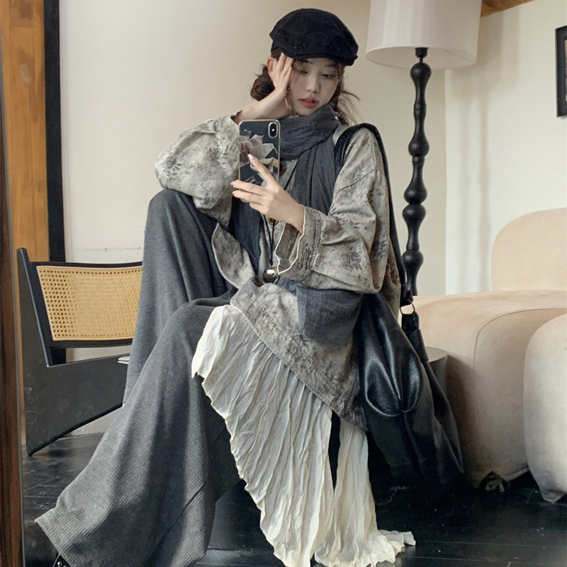 女装 套装 秋冬新款 阔腿休闲裤 胖妹妹复古宽松外套叠穿褶皱衬衫 大码
