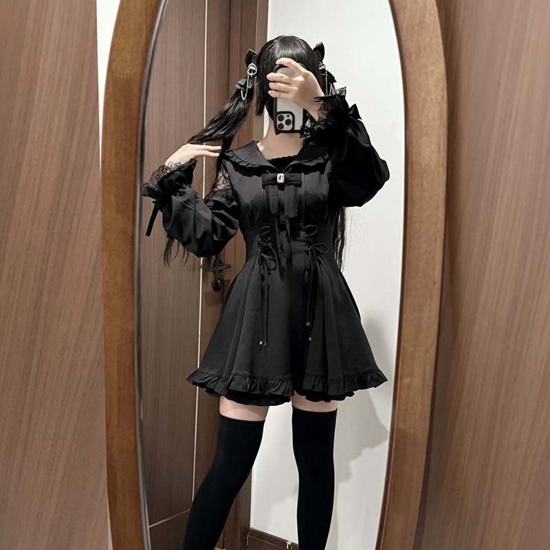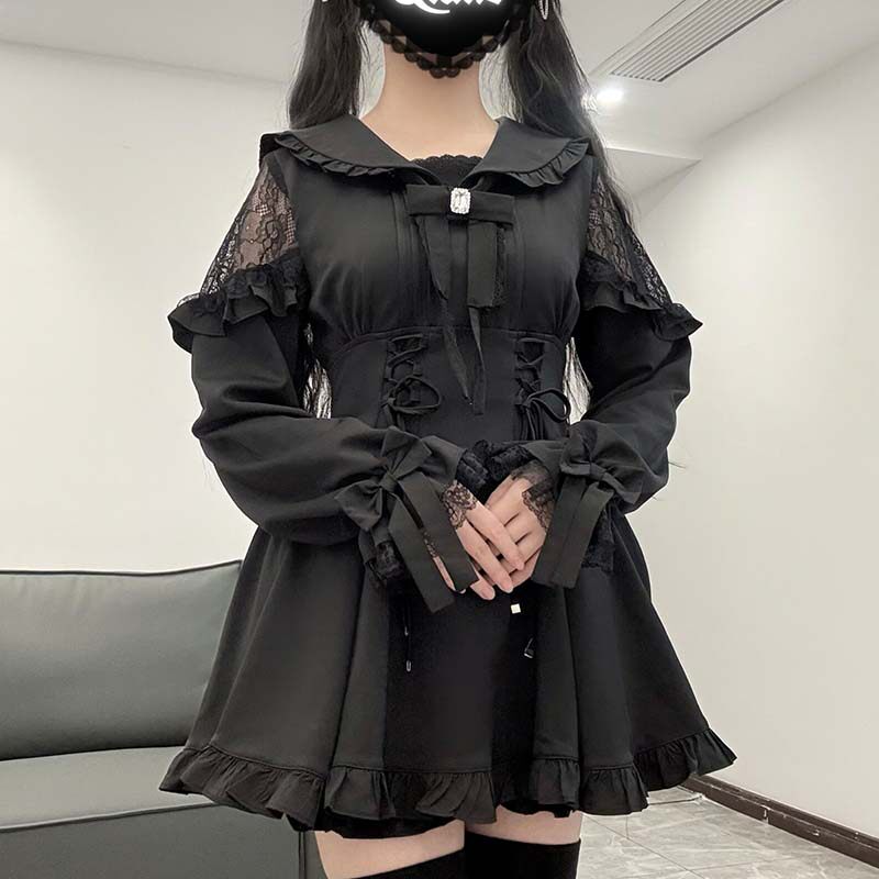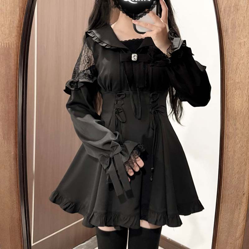 收腰蕾服裙子连衣裙 蕾丝黑色拼接水手领短长袖 松露森林 一团