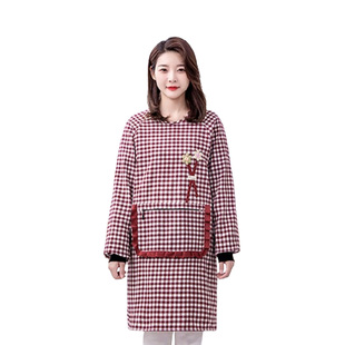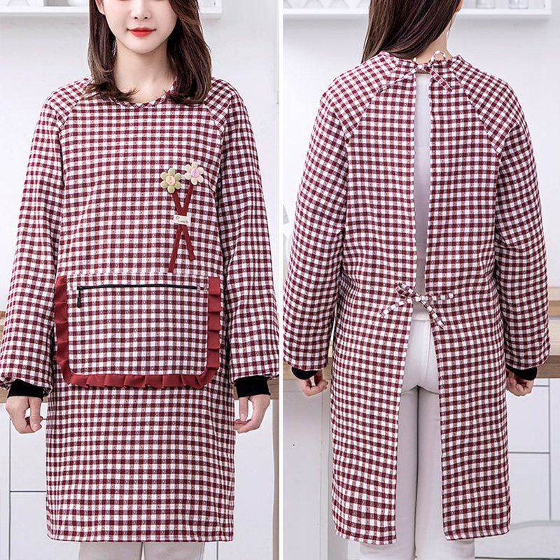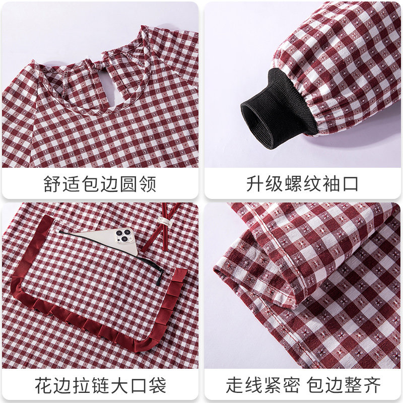 棉布老粗布纯棉围裙可爱格子带袖 女罩衣反穿衣加厚工作服 成人韩版