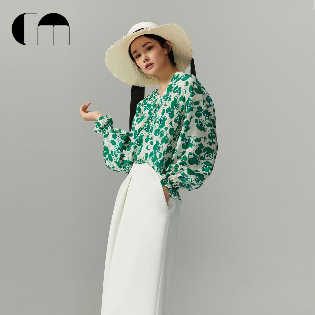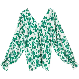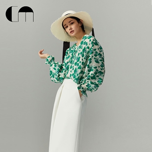 女士上衣衬衫 COMME MOI吕燕设计师早春设计感真丝印花V领灯笼袖