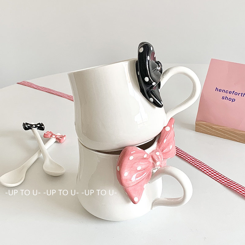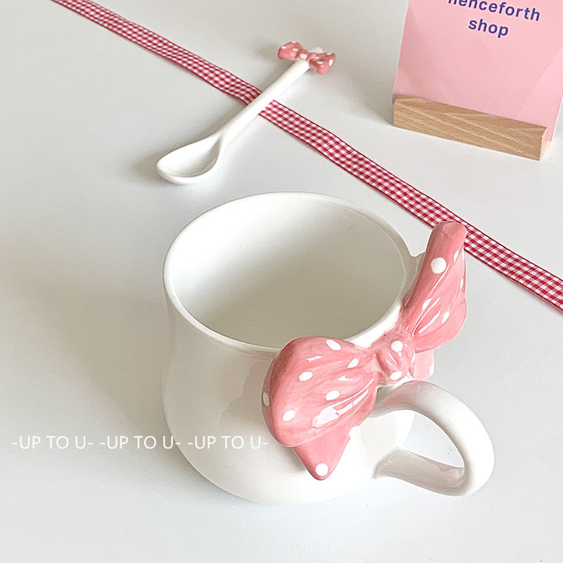 SHˇ设计款 ins立体蝴蝶结水杯女生高颜值带勺马克杯大容量送女友