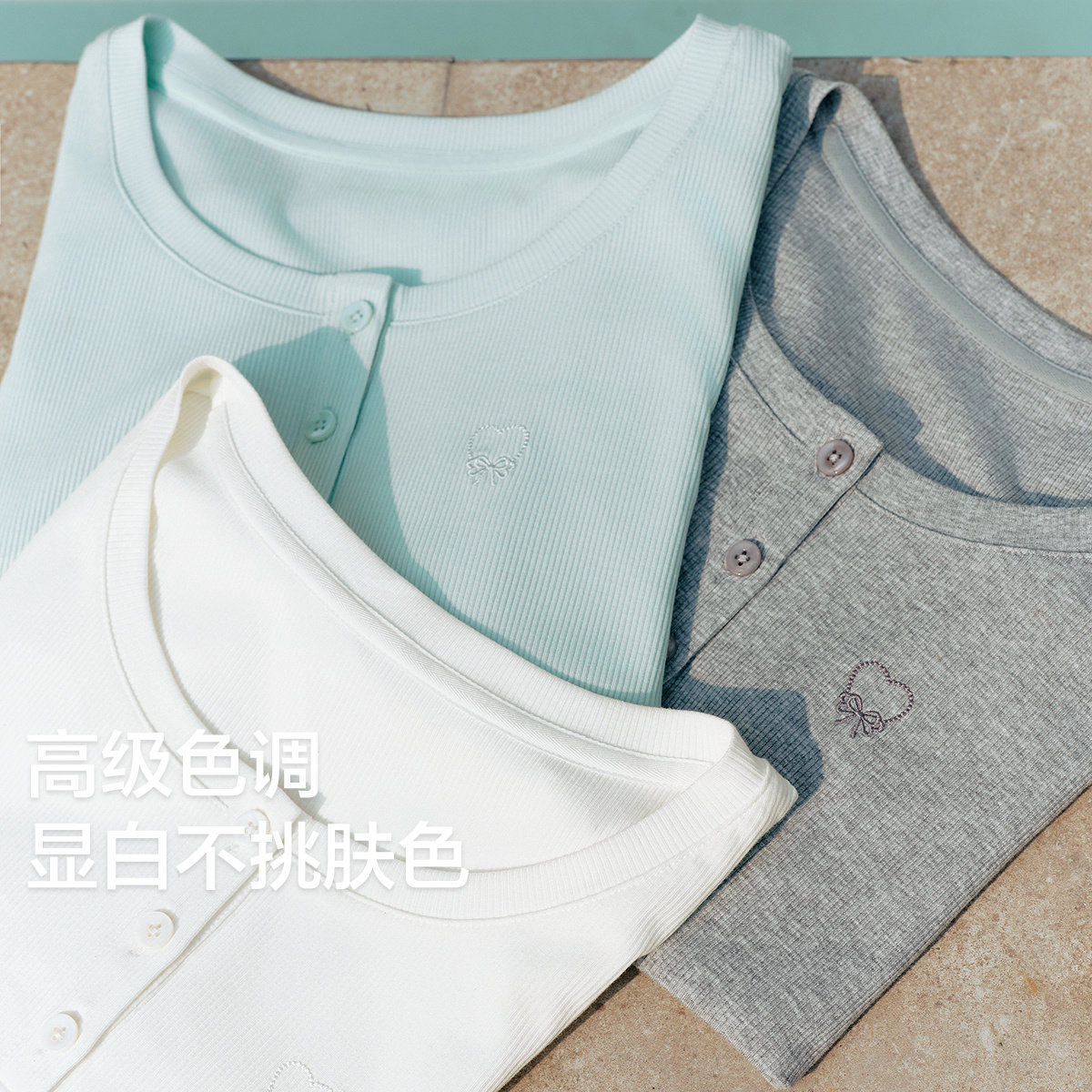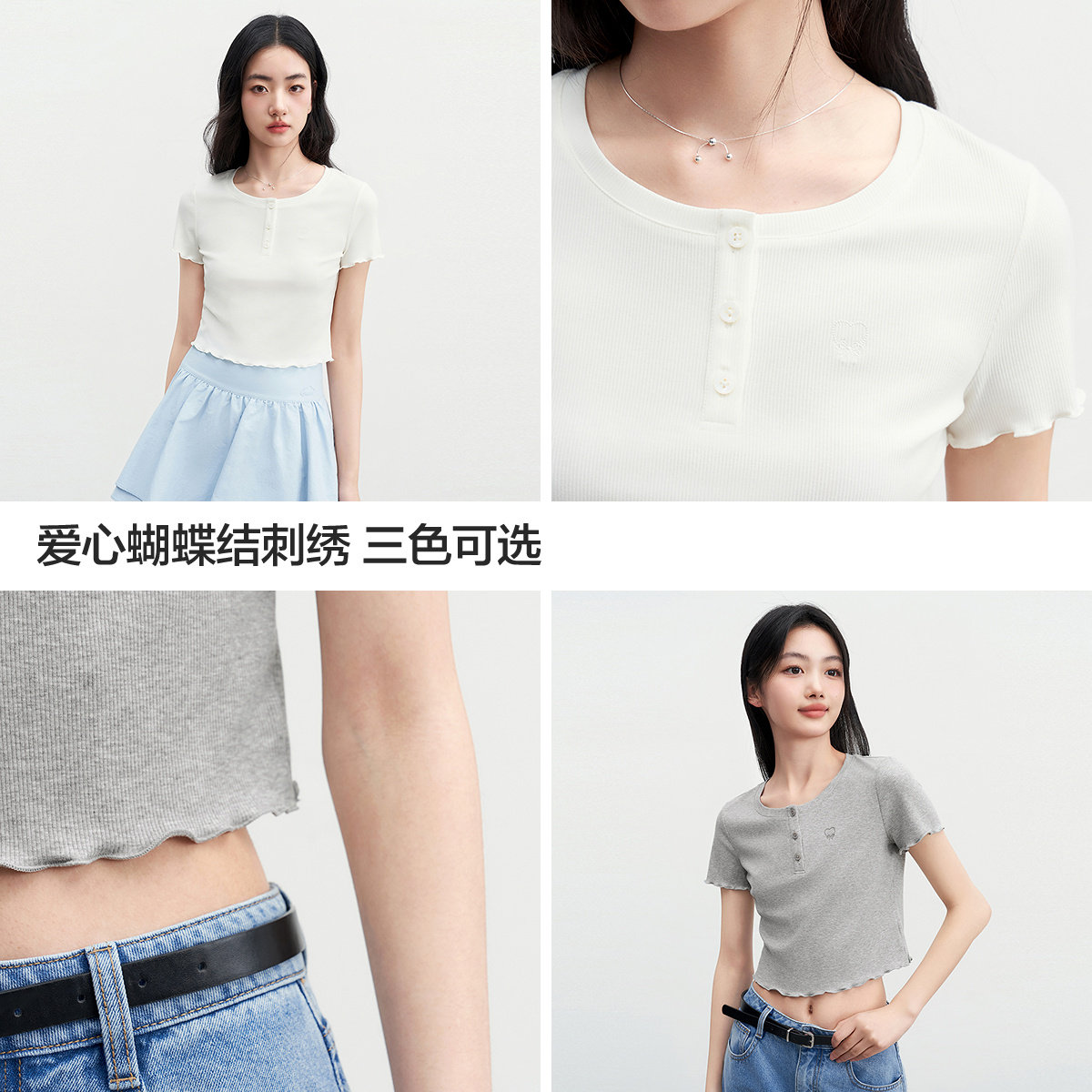 爱心蝴蝶结刺绣木耳边T恤 2025夏新款 乐町通勤正肩亨利领短袖 短款
