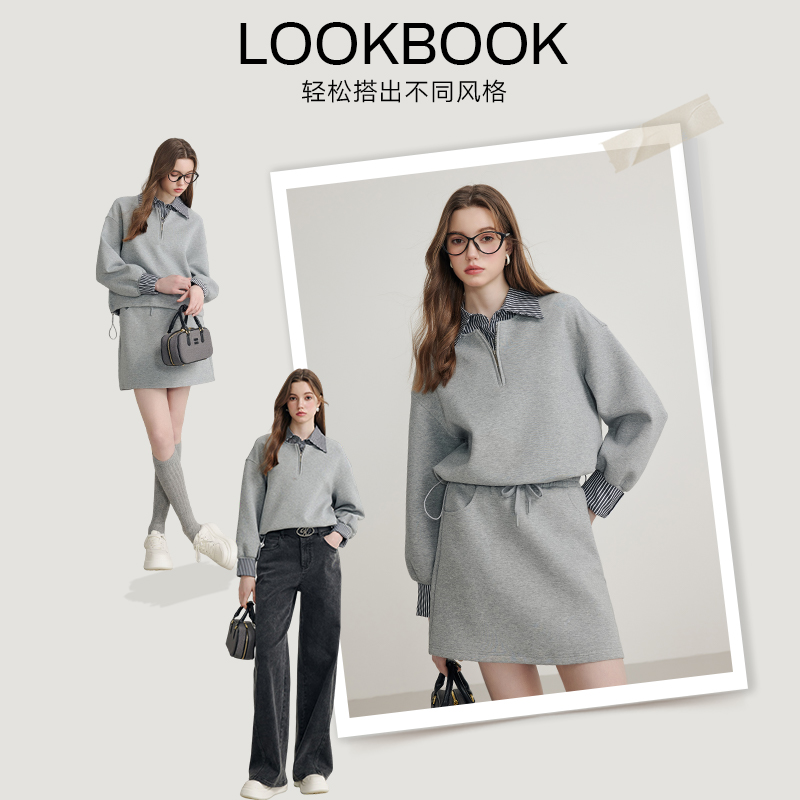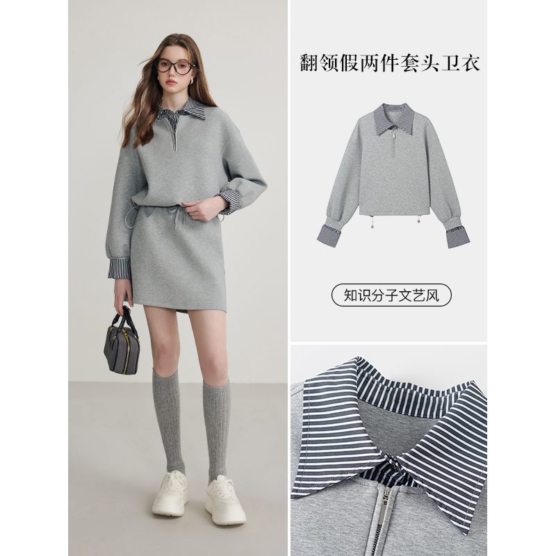翻领假两件半拉链卫衣灰色半裙直筒牛仔裤 推荐 热销爆款 KBNE