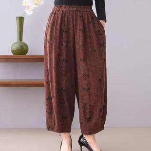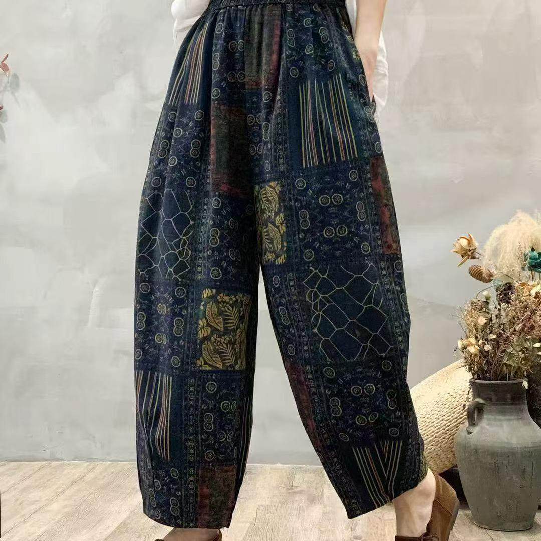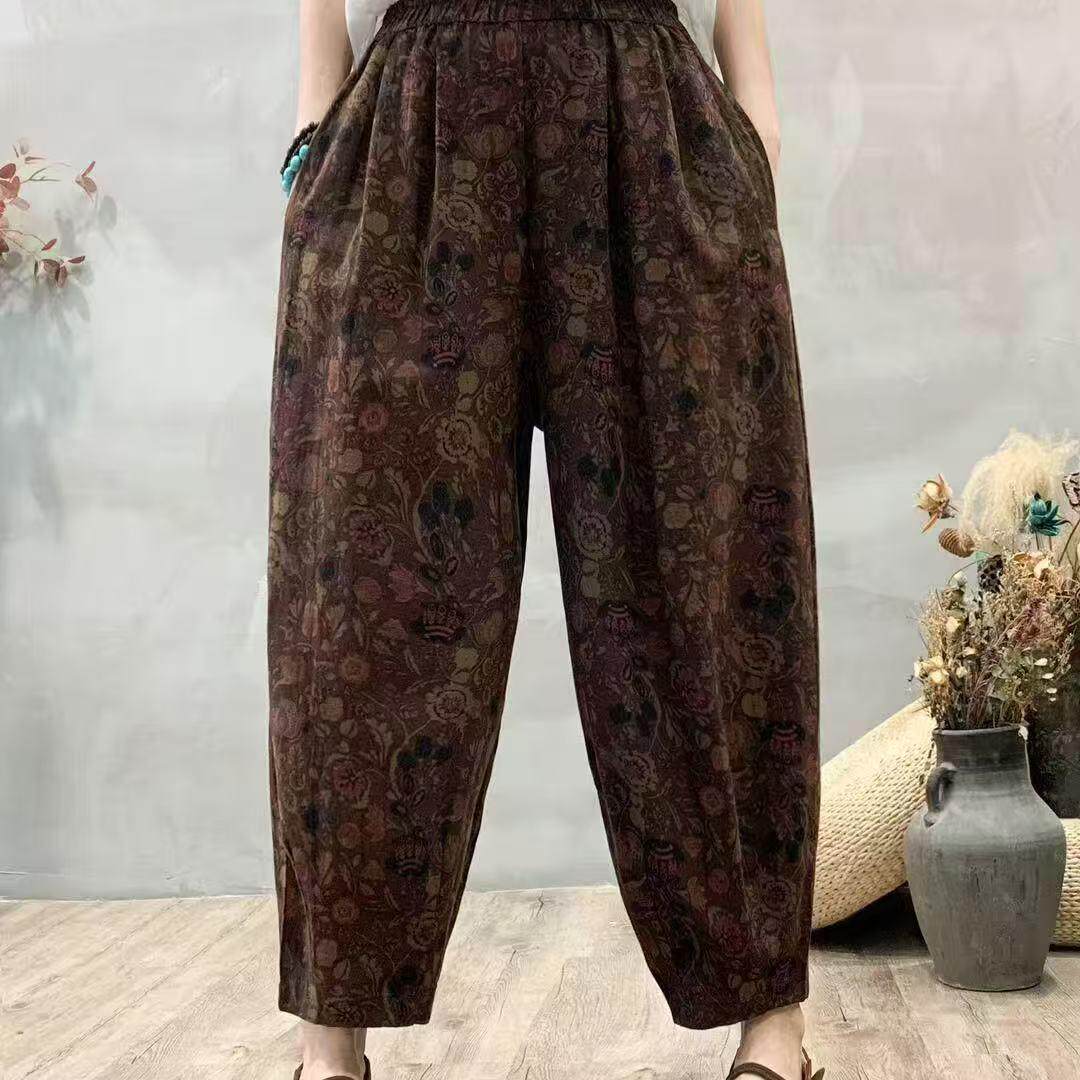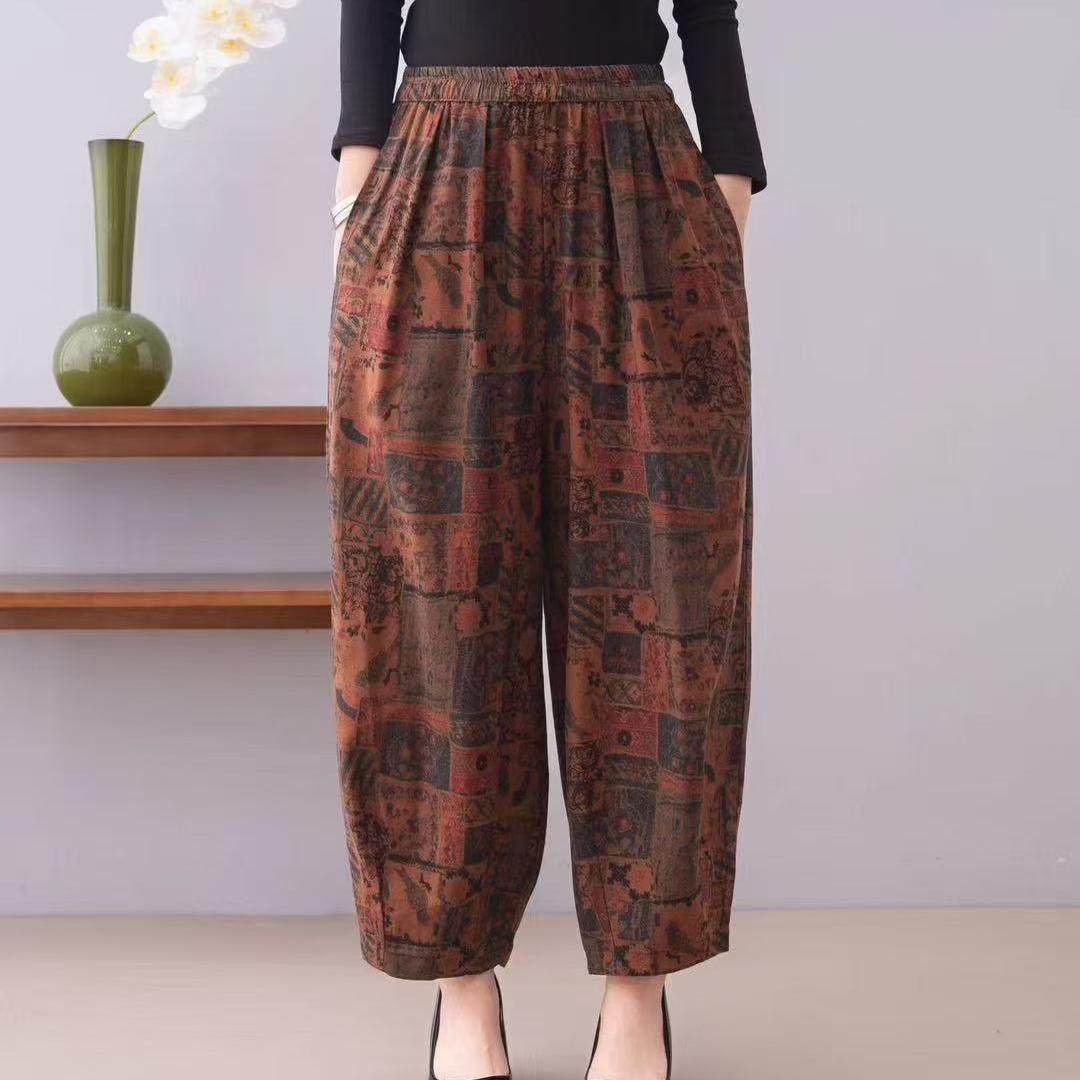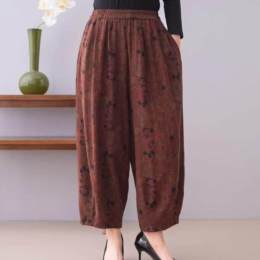 水洗棉麻八分裤 复古印花萝卜裤 女 宽松松紧腰哈伦裤 妈妈装 女夏季