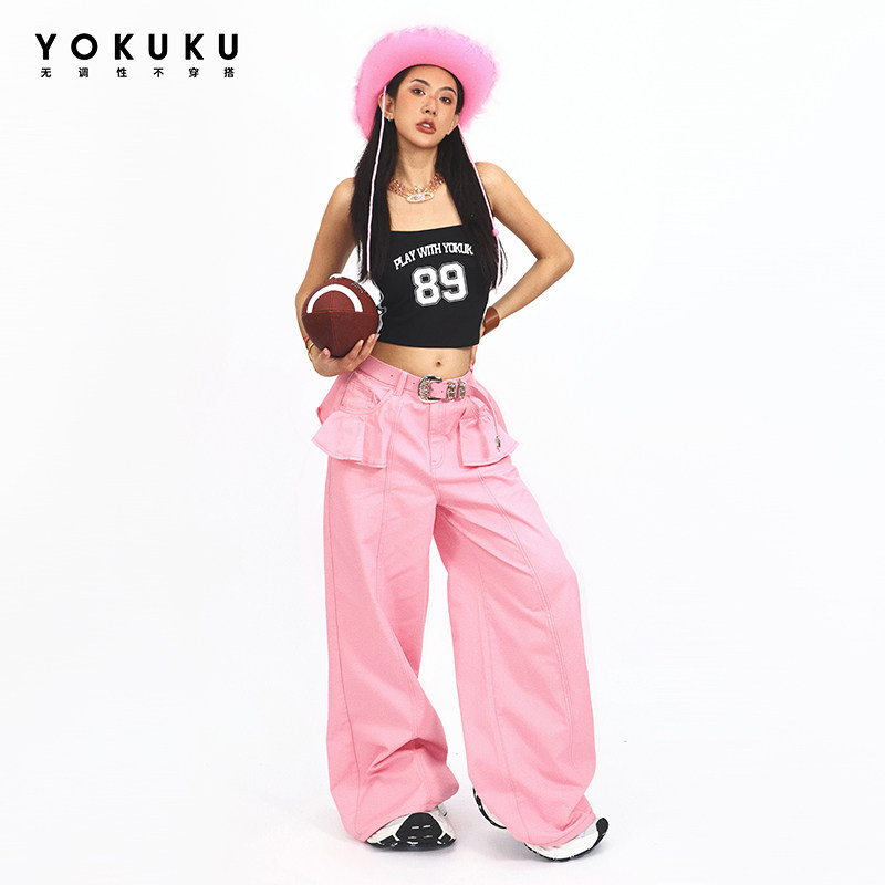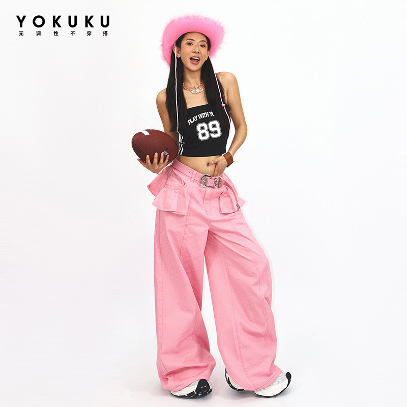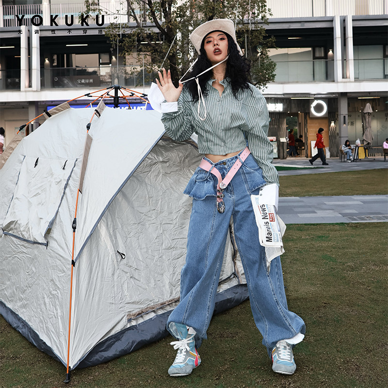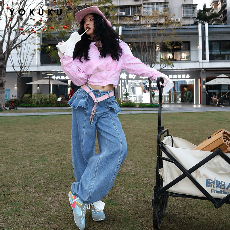 女宽松直筒牛仔裤 哟酷酷 荷叶边假两件阔腿裤 美式 女 恋爱疯长