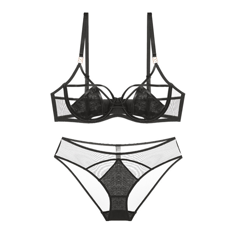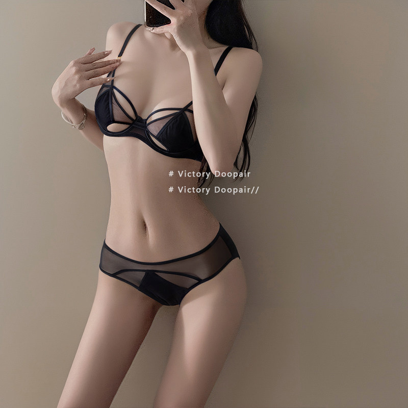 好奇蜜斯无痕内衣女法式 三角杯超薄无钢圈大胸显小胸黑文胸罩套装