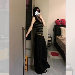 外穿修身 背心吊带女夏季 紧身美背上衣 辣妹灰色条纹大领口无袖 美式