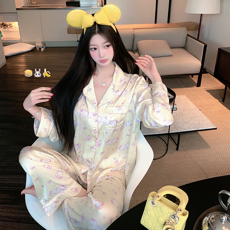 家居服套装 小奶猫翻领春秋款 纯棉双层纱布薄款 睡衣女士长袖 大码