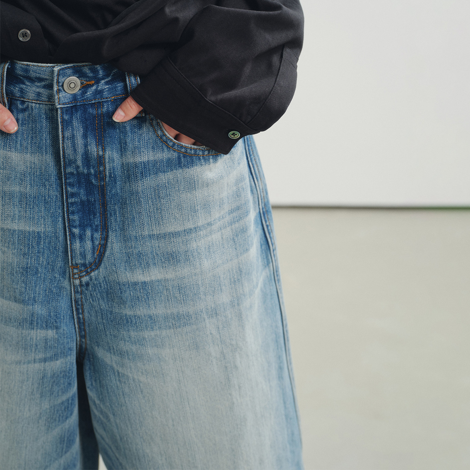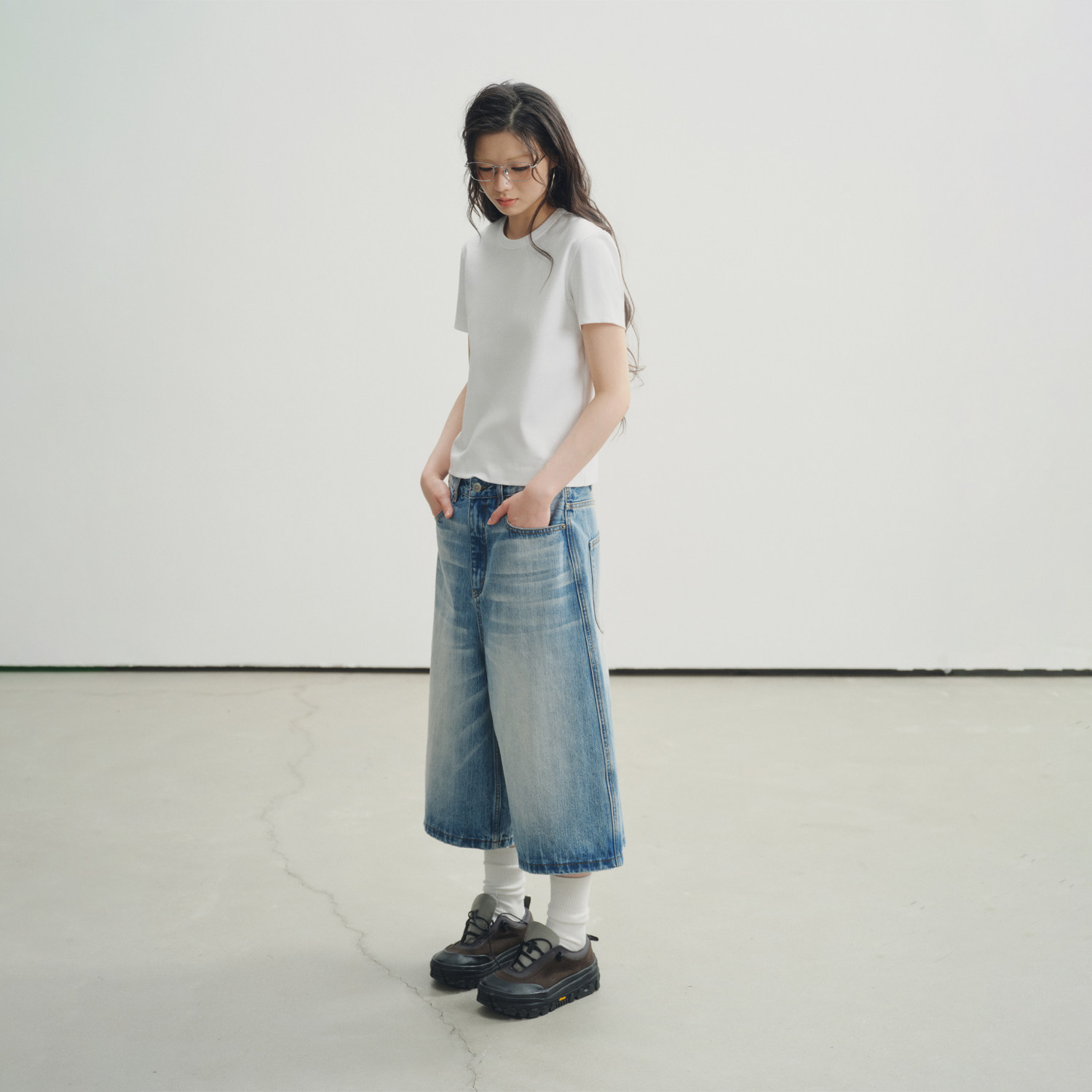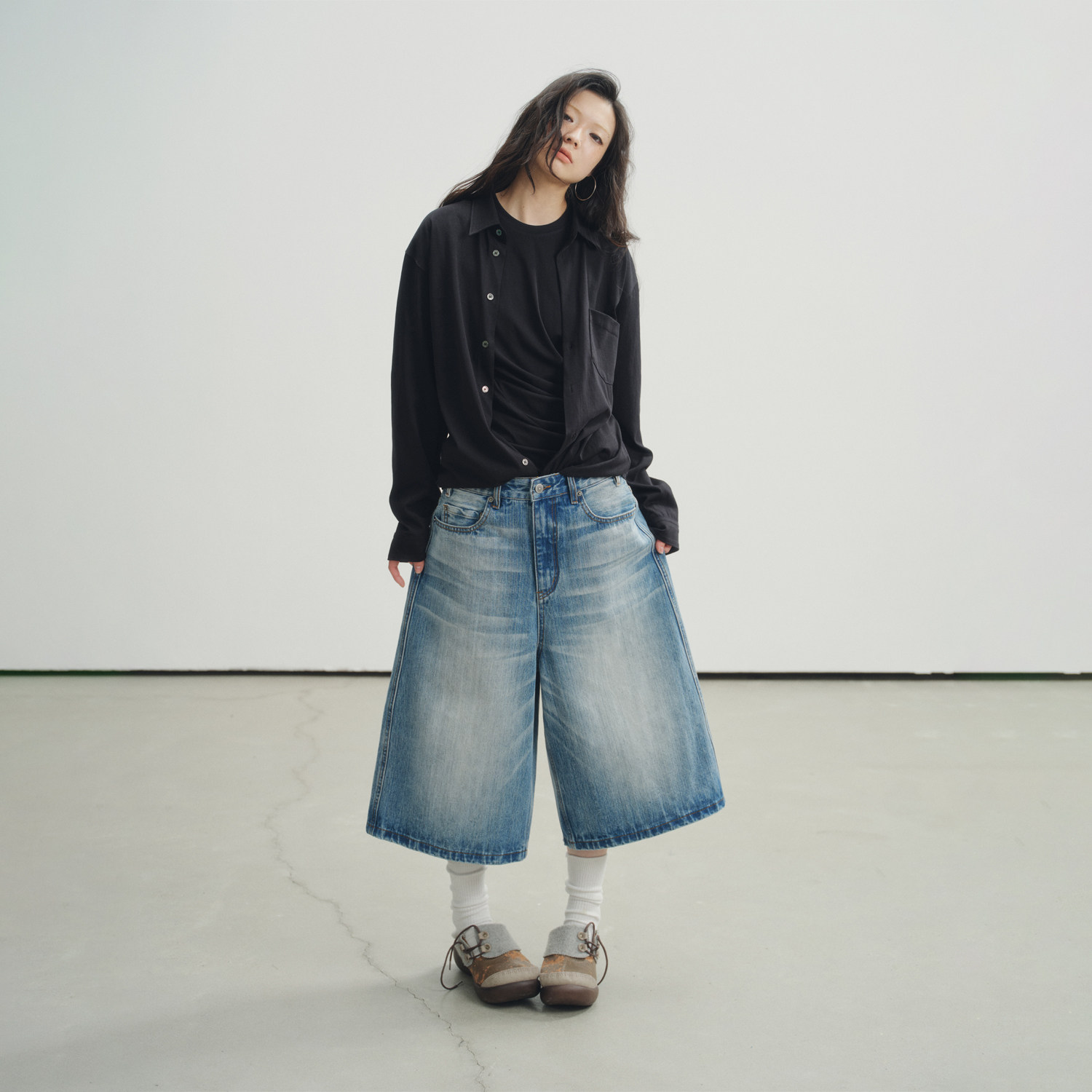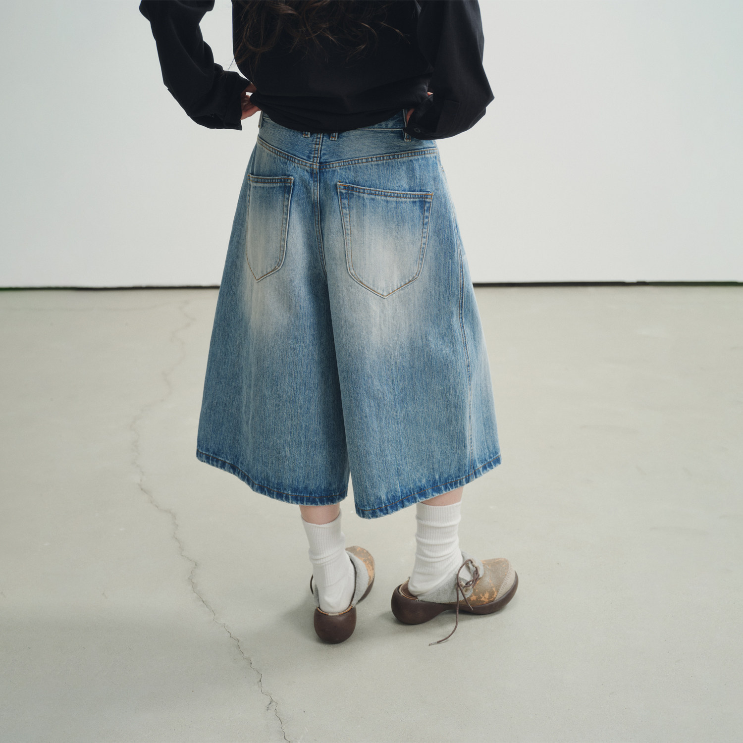 复古水洗做旧立体猫须宽松七分牛仔短裤 竖竹纹理 别致 VERMO