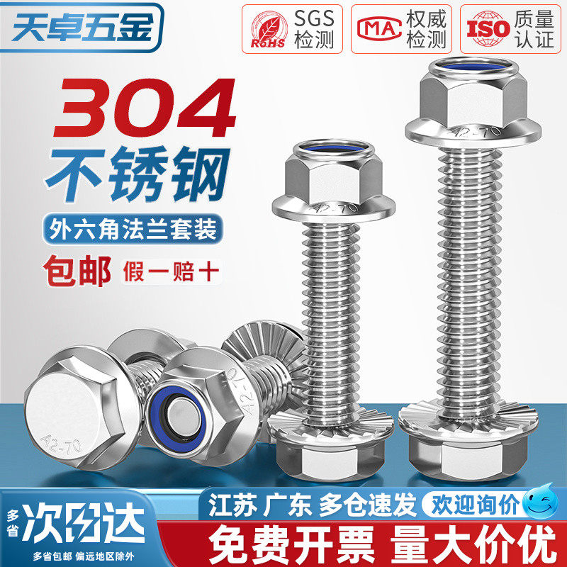 304不锈钢法兰面防滑外六角螺丝钉螺栓尼龙防松螺母组合5M6M8 M12