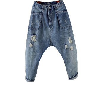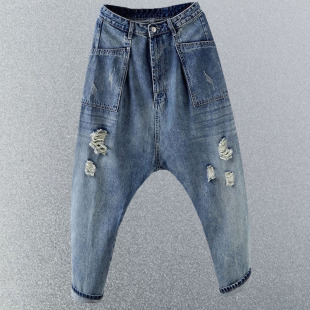 破洞潮流哈伦裤 女牛仔裤 韩版 宽松垮裤 子 2026春季 小脚九分裤 大裆裤