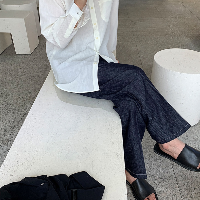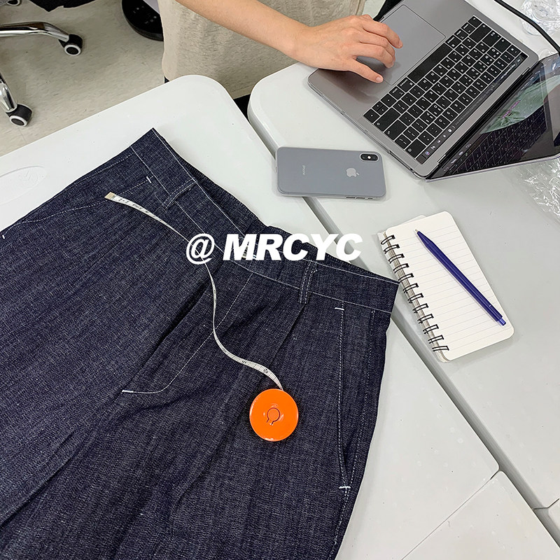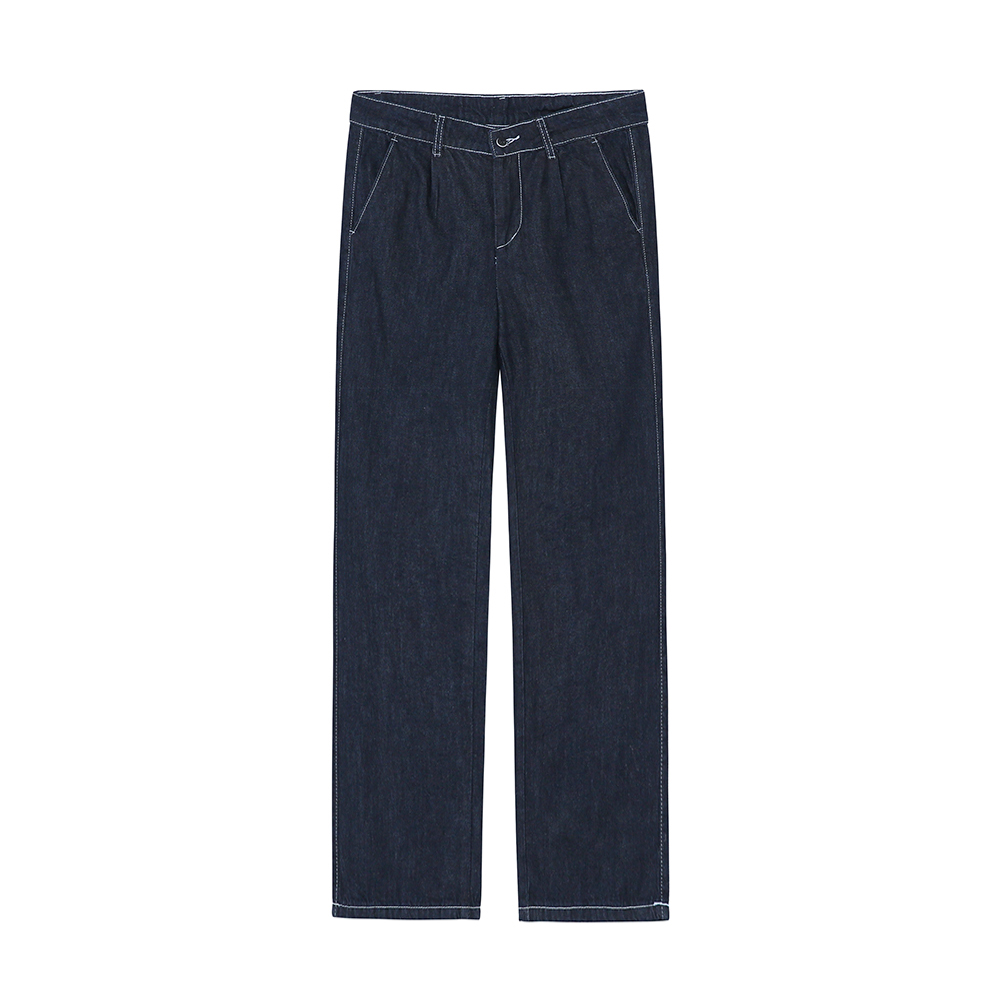 KREATE「斜门襟排扣」12oz条纹原牛打褶微A字阔腿牛仔休闲长裤