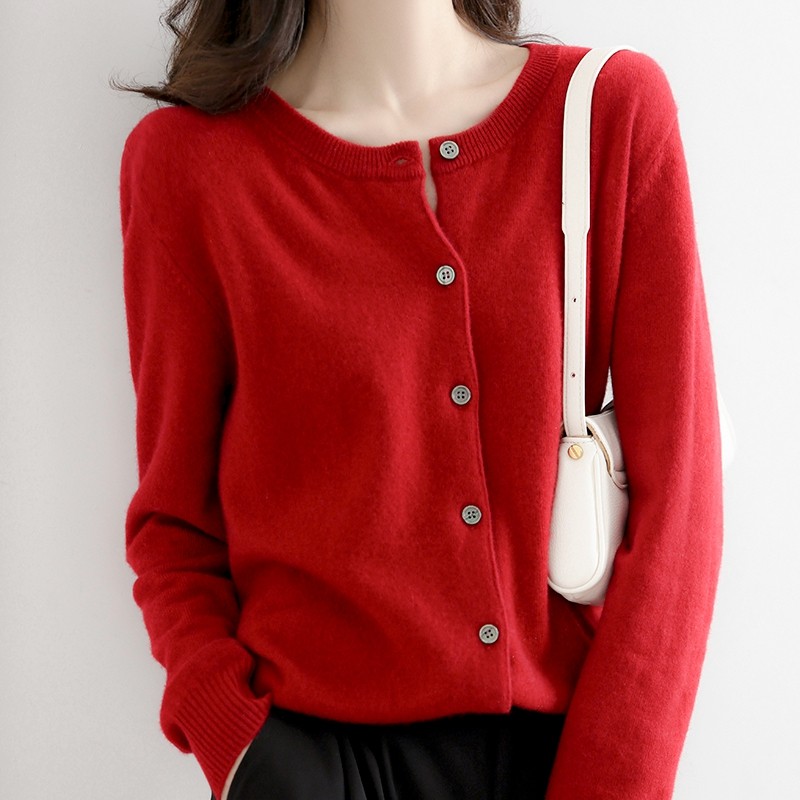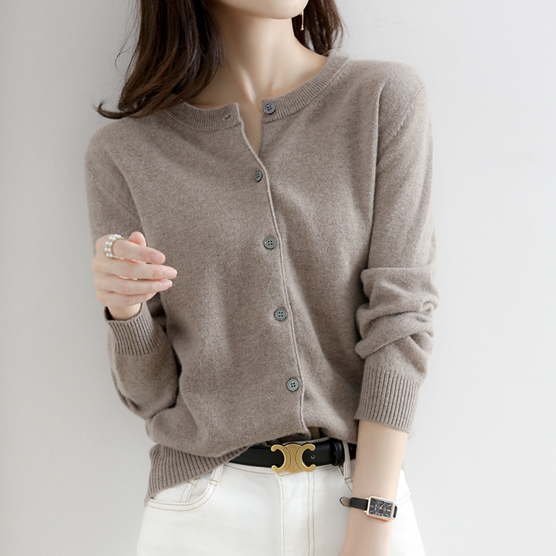 女秋冬修身 高级手工定珠圆领100羊毛针织开衫 打底毛衣 Lin Maven