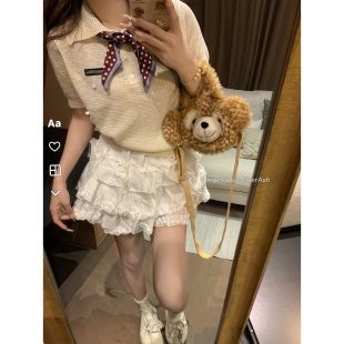 DDXZ夕子韩系学院风POLO领上衣配波点丝巾杏色薄款 T恤女 针织短袖