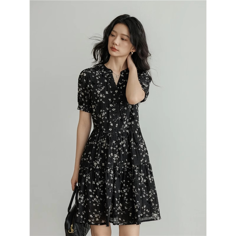 显瘦a字裙休闲短裙 2025短袖 爵莱菲大码 v领碎花设计感连衣裙女夏季