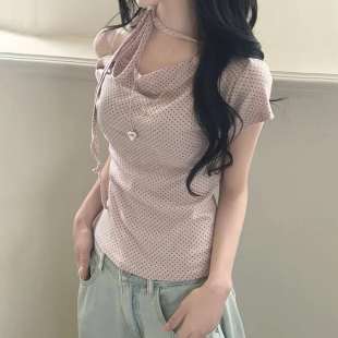 减龄百搭上衣 T恤女纯欲性感露肩时尚 eilove法式 波点绑带斜领短袖
