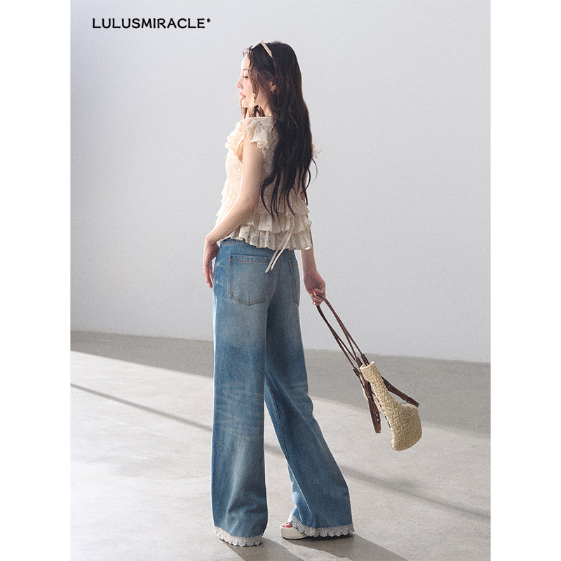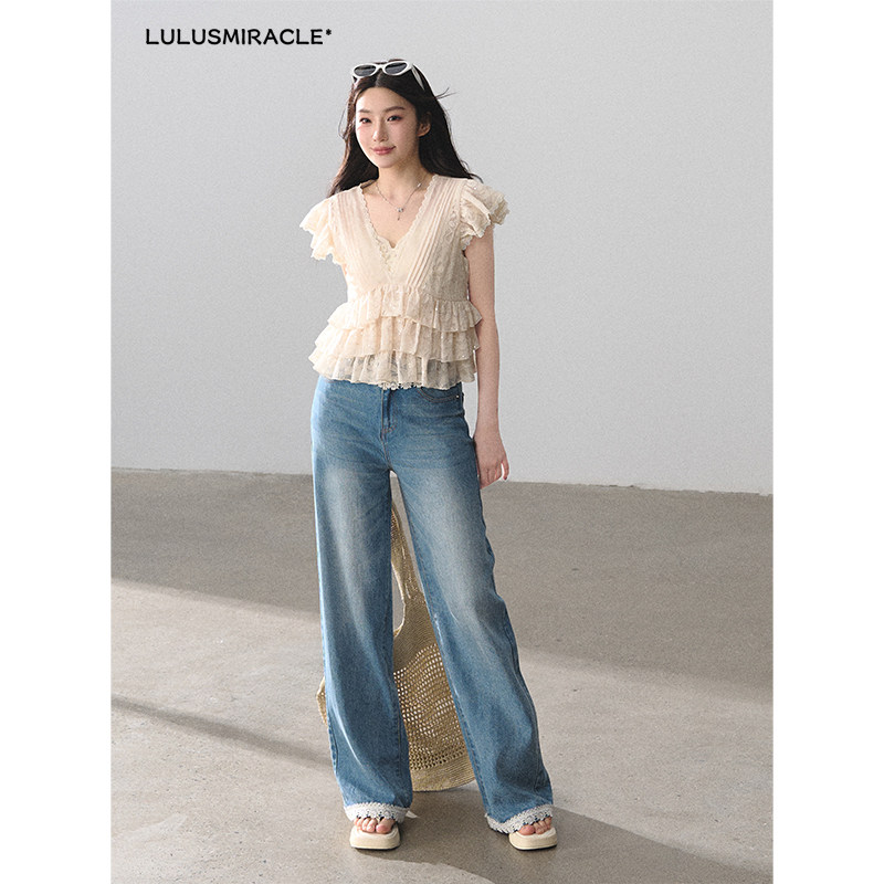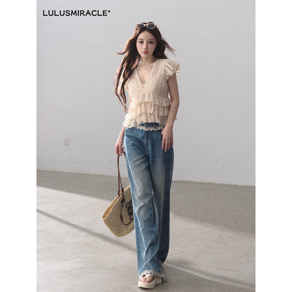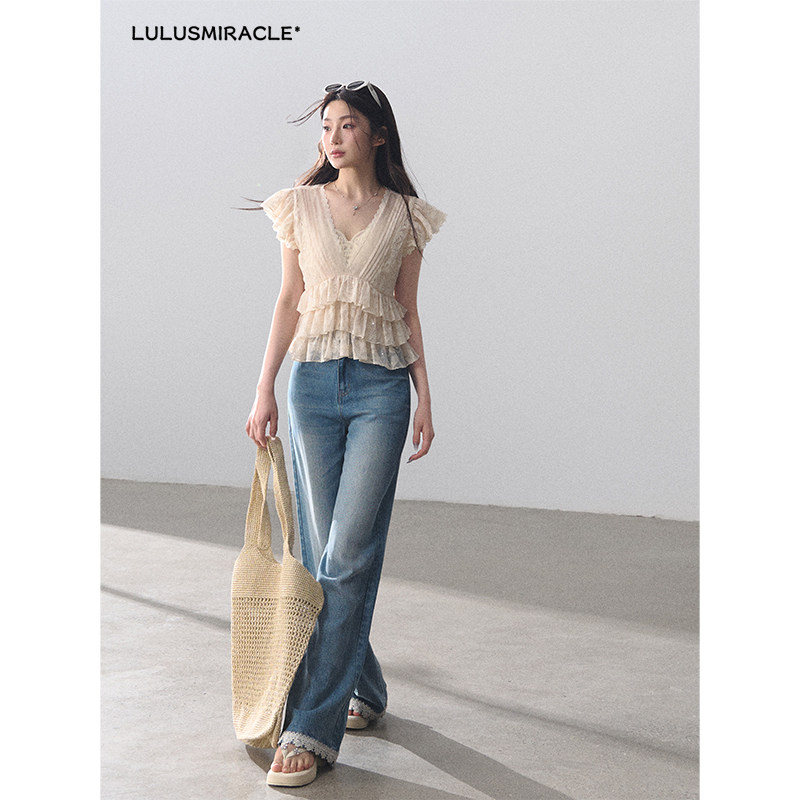 套装 LulusMiracle 上衣牛仔裤 气质蕾丝荷叶边V领小衫 恋爱序曲