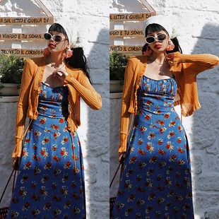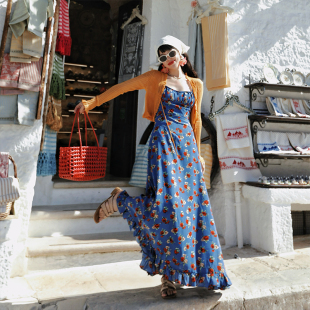 复古蓝色玫瑰印花吊带连衣裙度假风长裙 法式 麦叙原创 蓝调玫瑰