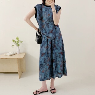 棉绸无袖 套装 上衣七分裙裤 人造棉时尚 两件套女大码 2026年夏新款