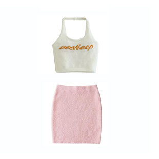 辣妹挂脖针织背心包臀裙套装 仿貂绒毛毛软和纯欲小清新短裙二件套