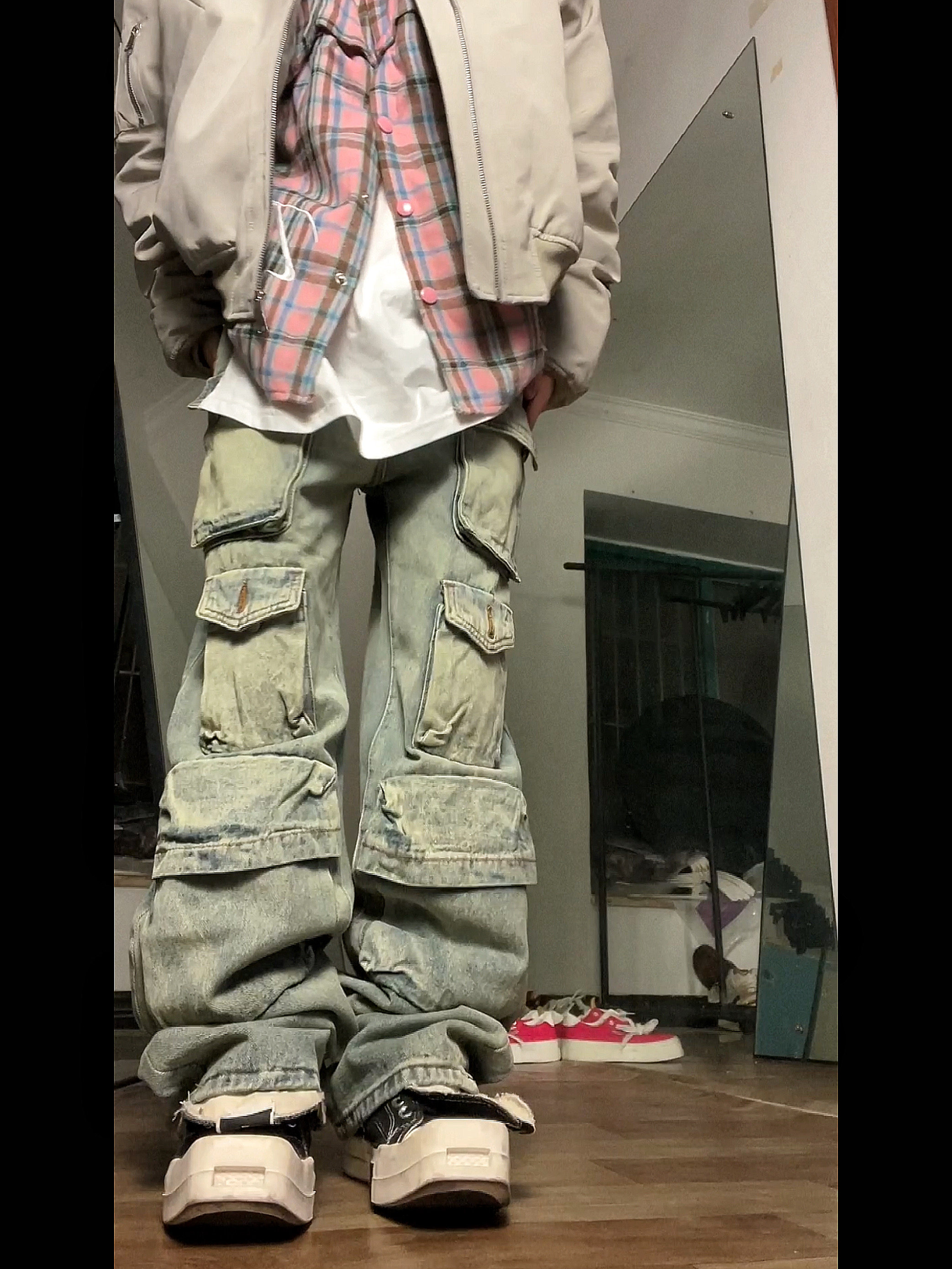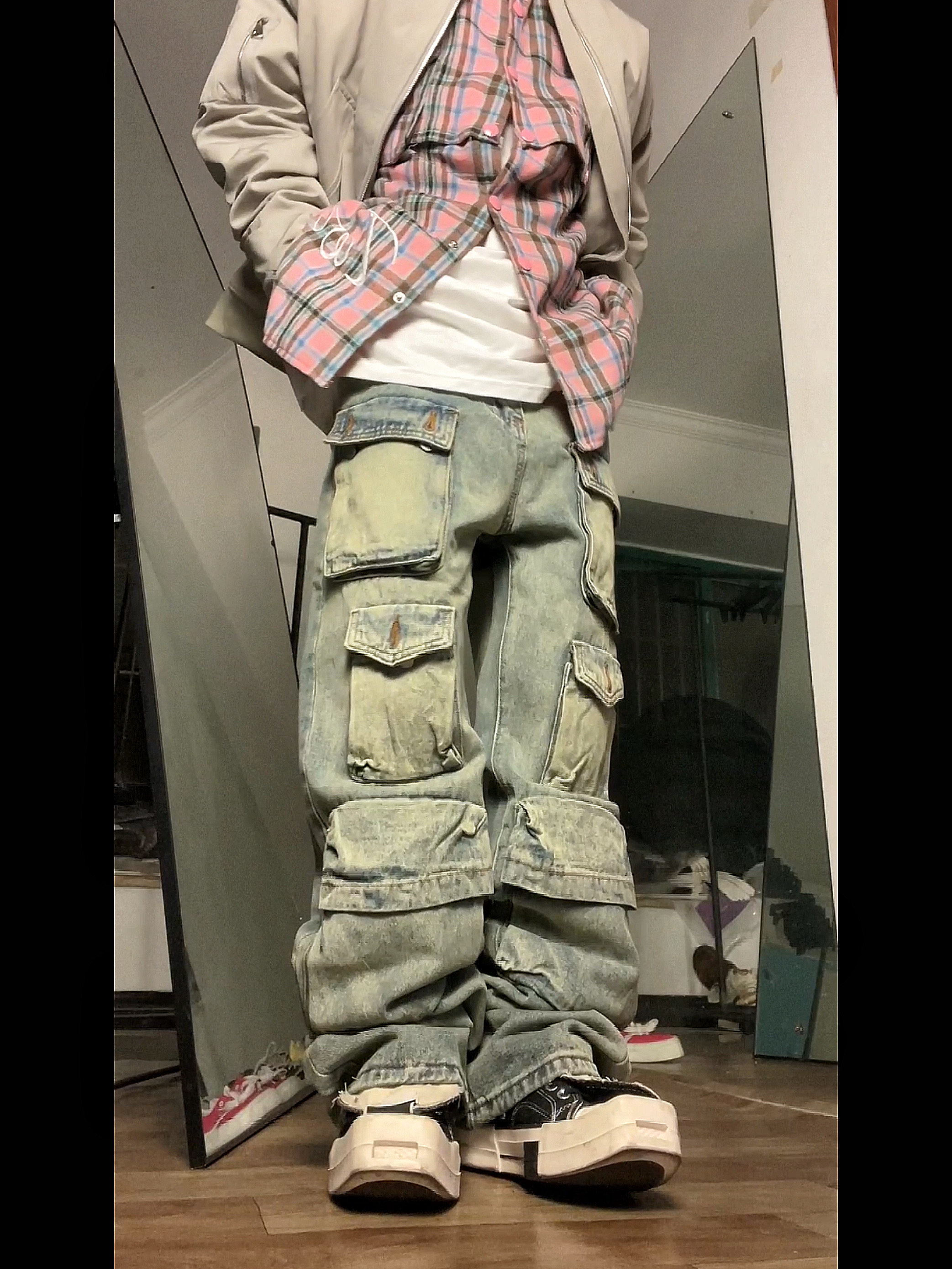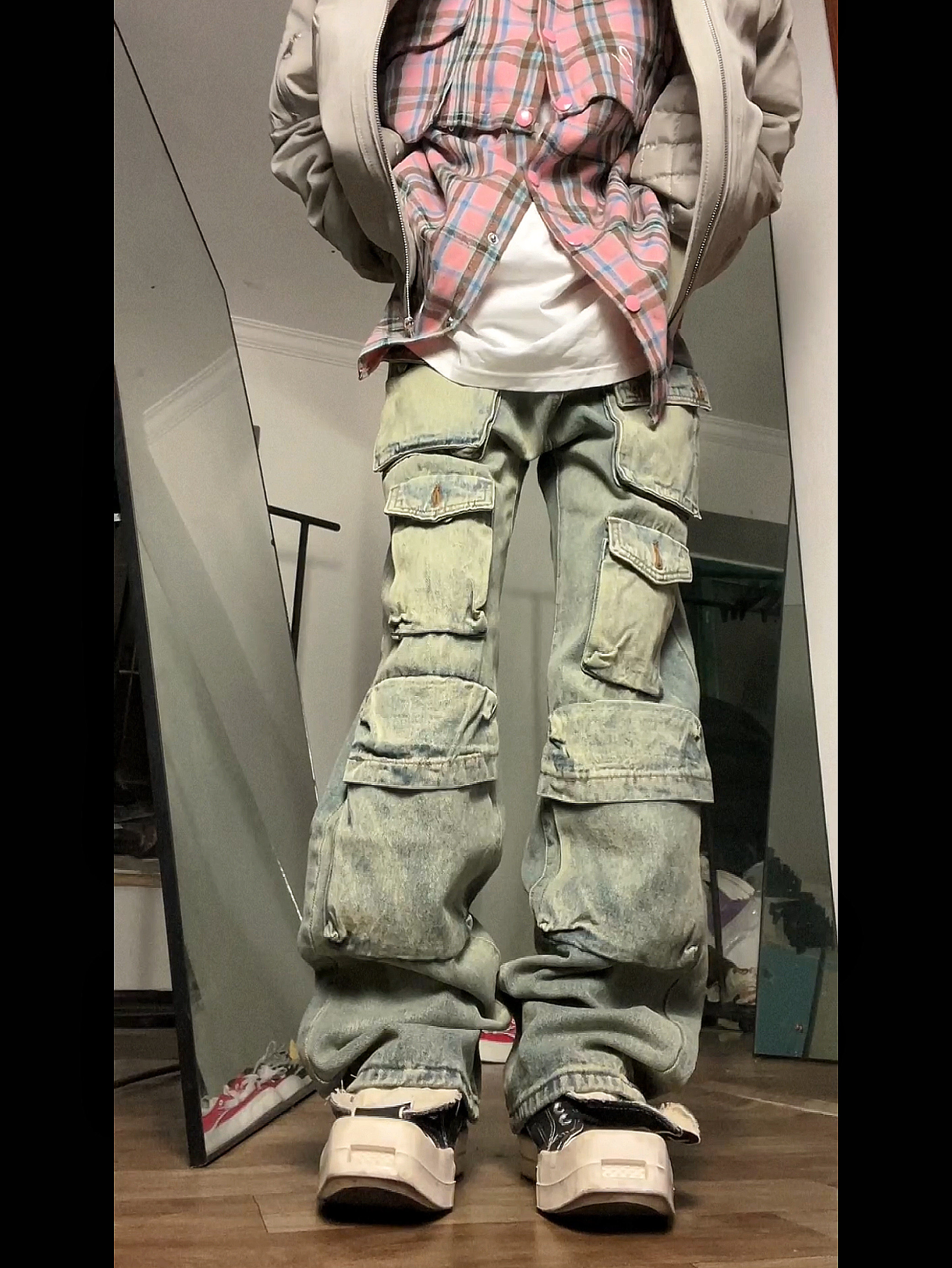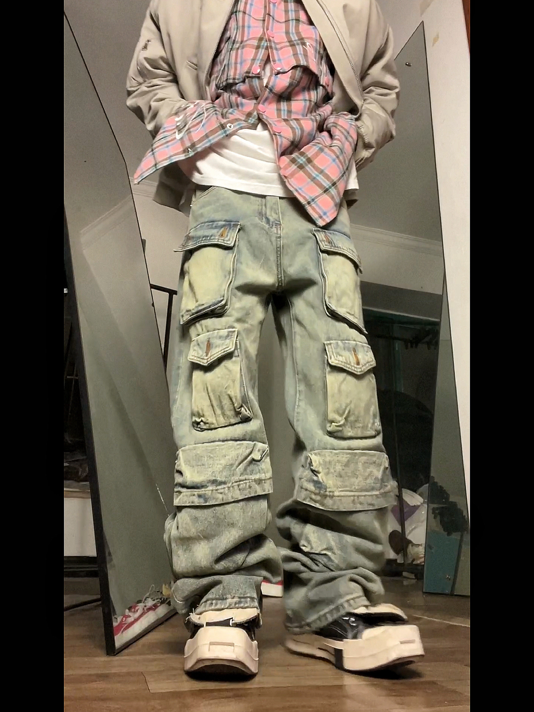 男女复古直筒裤 F383 2022AW国潮原创黄泥染水洗做旧多口袋牛仔裤