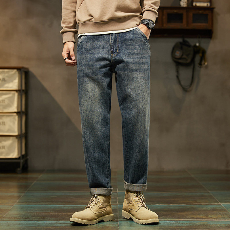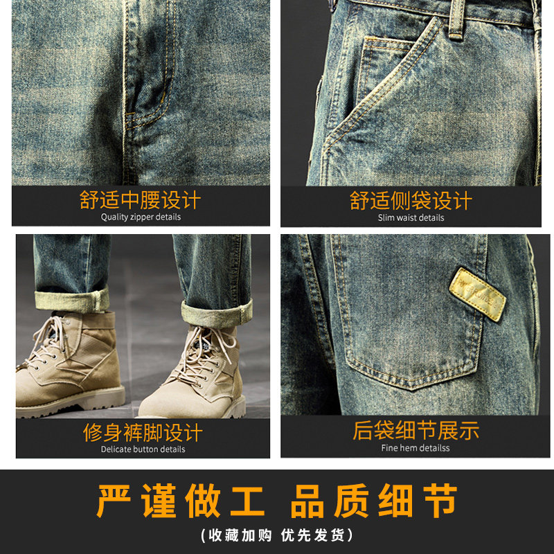丹宁直筒重磅养牛蓝色长裤 复古原牛赤耳牛仔裤 子男秋 美式 马登工装