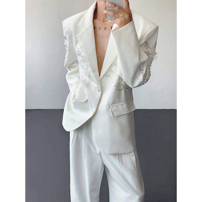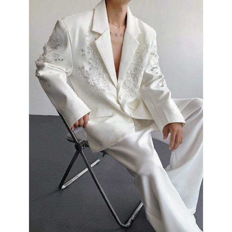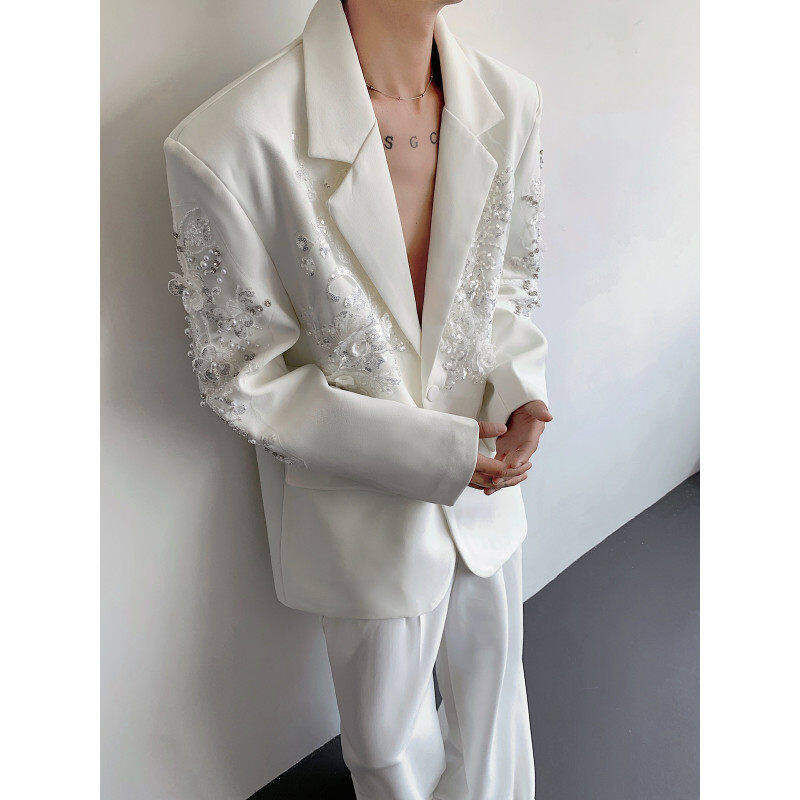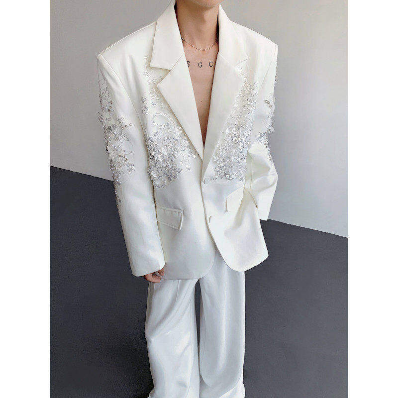 秋季 外套男高级感气质礼服白西服 重工立体亮片刺绣设计感垫肩西装