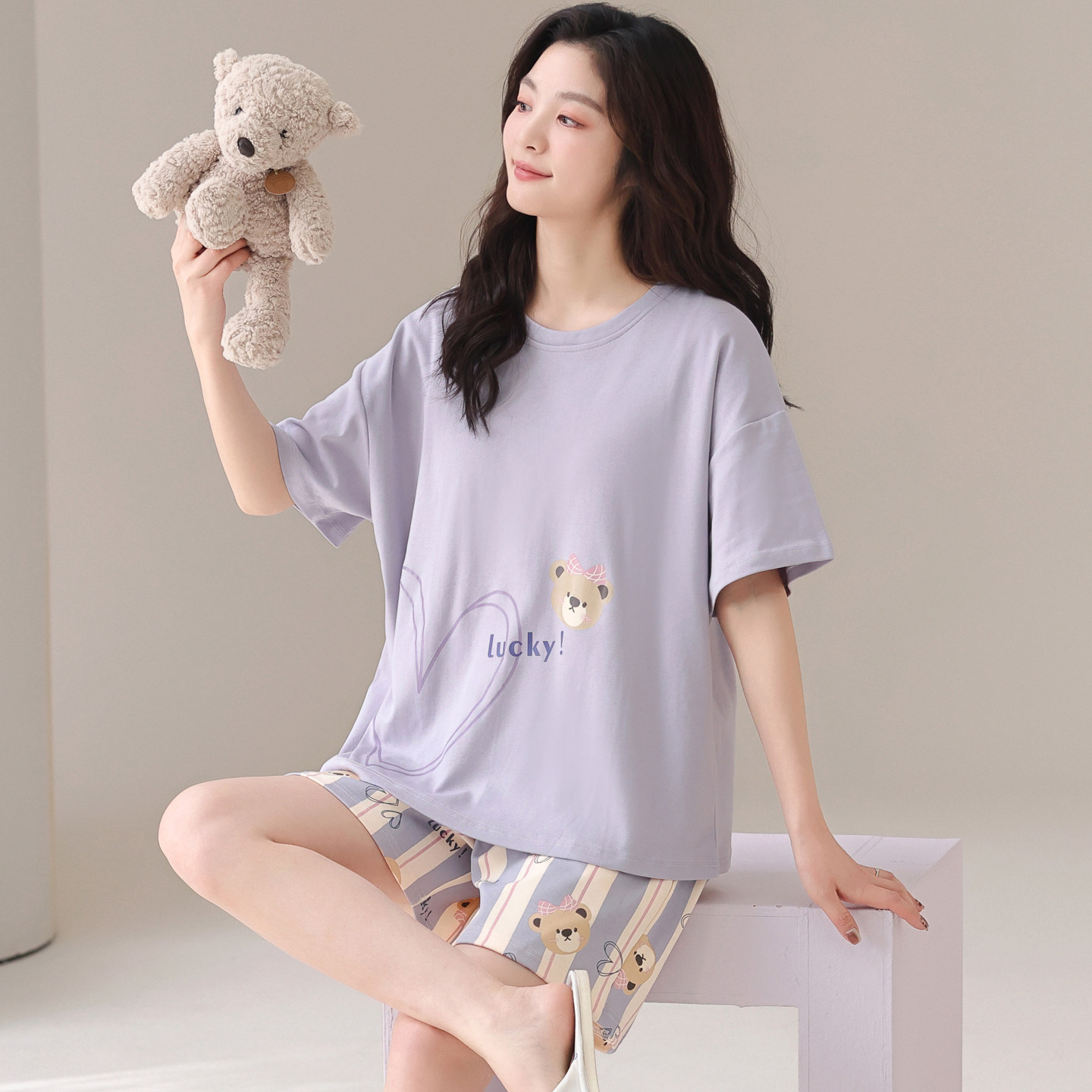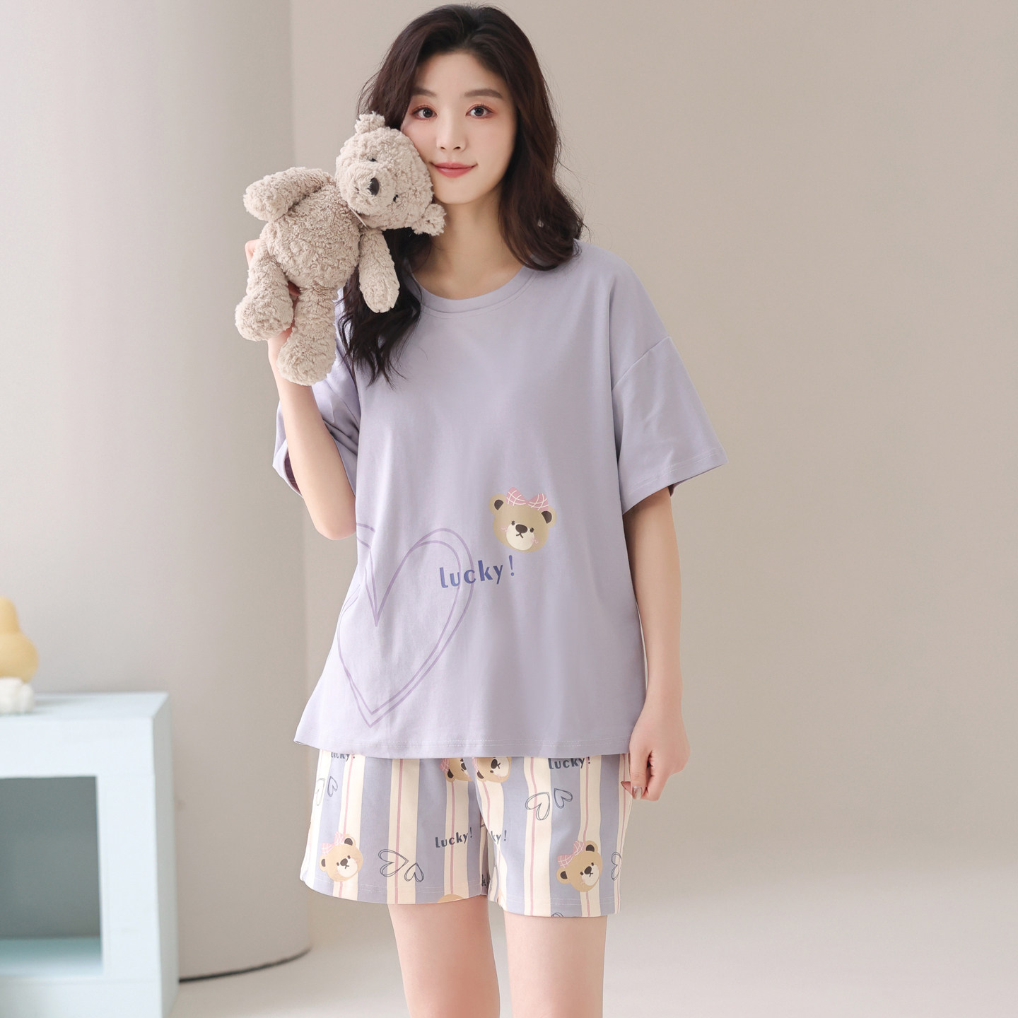 带胸垫紫色熊短裤 卡之恋睡衣女款 纯棉短袖 夏季 条纹家居服 2026新款