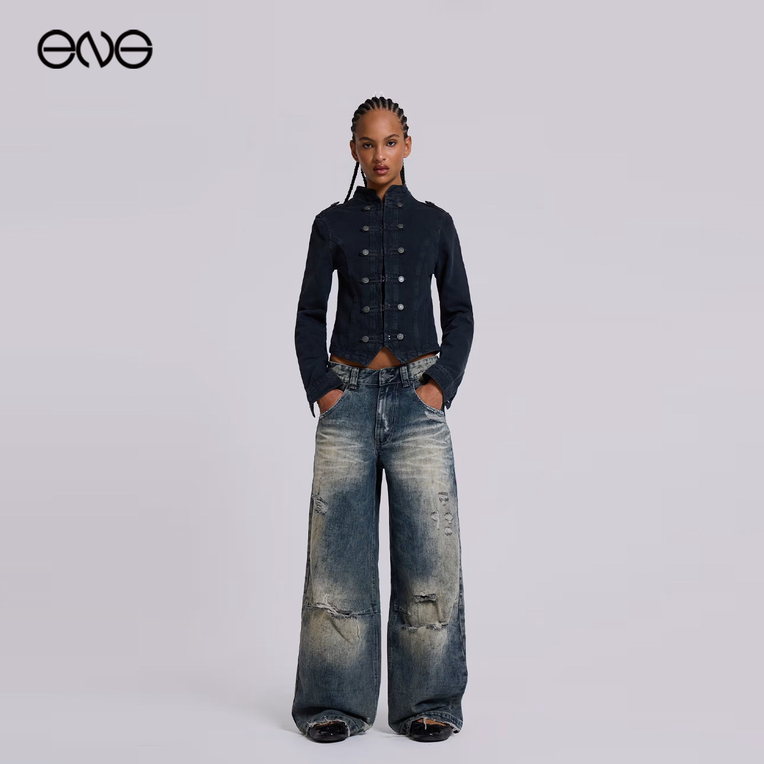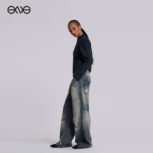 女小个子低腰直筒阔腿裤 十一石 磨破明线绣花牛仔裤 王 新晋裤