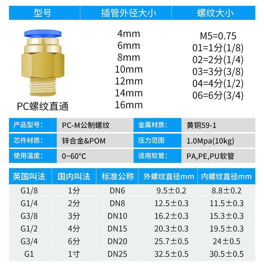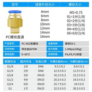 2.0粗细距快插铜 1.5牙1.5 111111 M202 非标公制螺纹接头定制PC8