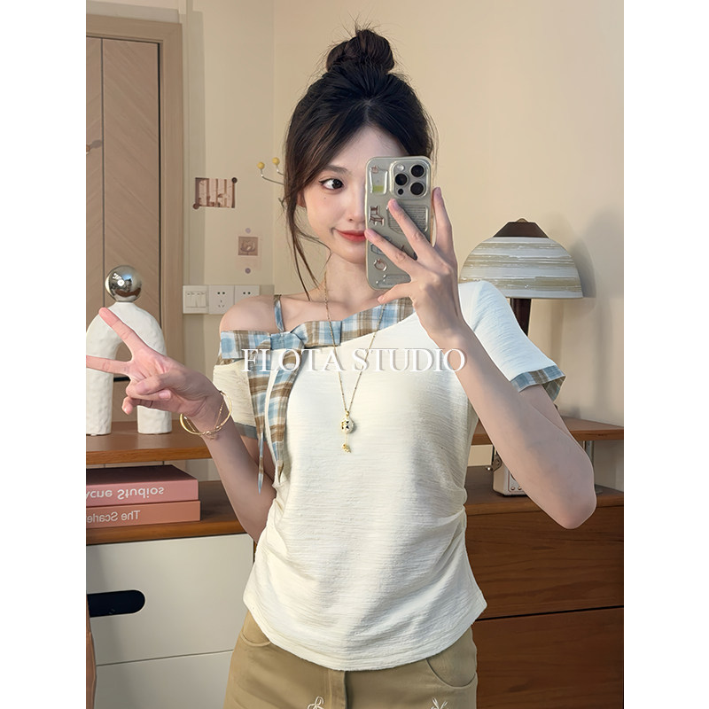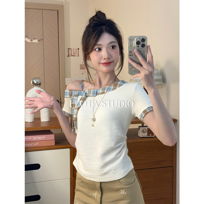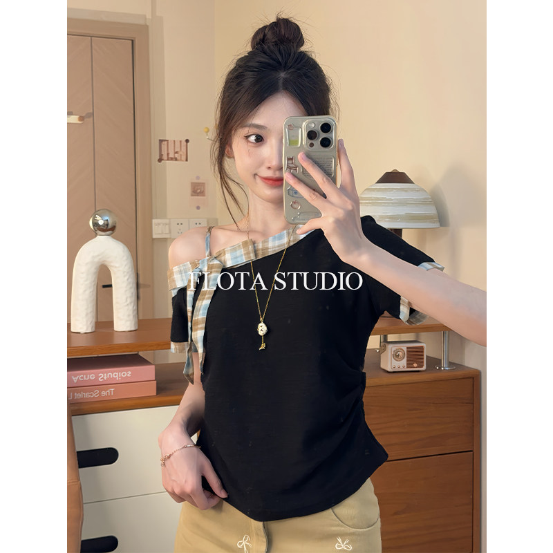 短款 T恤女复古格纹修身 气质左露肩斜领收腰短袖 上衣 flota